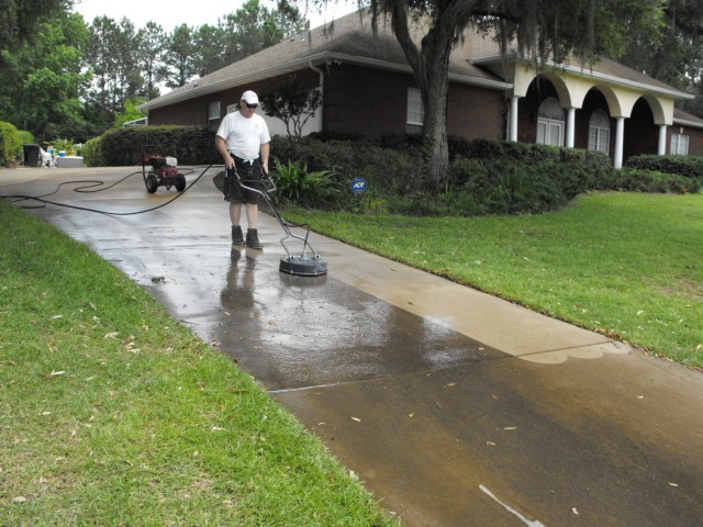 After we clean with the sureface cleaner we rinse with a ball valve then coat the sureface with a light S/H mix. Seems to clean up nice. The ball valve waters the edge nice. Never have dead grass