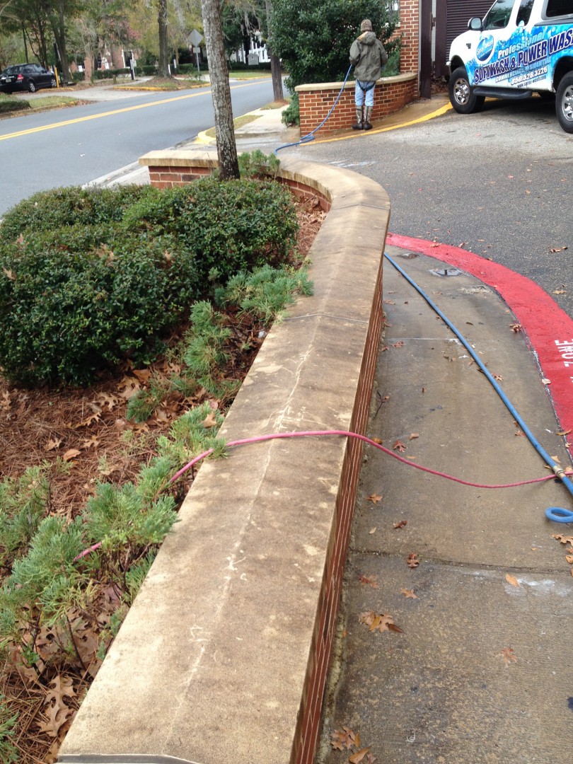 Cleaned the whole building including retaining walls, roof, walkways and exterior walls. Had two crews and two lifts on site, will only need one for the touch-up work. Square footage of building is somewhere around 20,000 feet