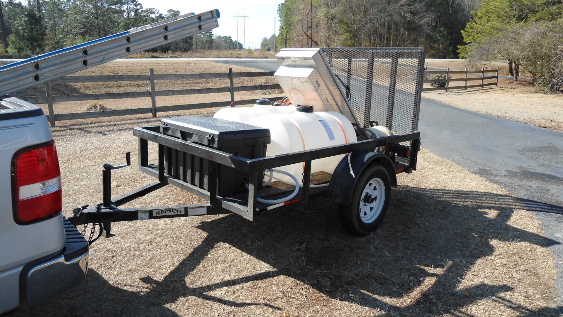 It's just your basic 6x8 trailer with a black plastic tool box up front that holds the pump, batteries and a few supplies. It originally had two 55 gallon drums and last year replaced with two 65 gallon leg tanks. I roll up all the hoses by hand (chemical and water) and when it comes to the ladders … I strap them down in the bed of the truck after every job. I used a 1 ½ ” PVC down tube and 1” poly braid hose that feeds the inlet side of my pump. When one tank went dry or if I had to switch over to a tank with a house wash mix, I would have to pull the down tube out, to switch over to the other tank.
