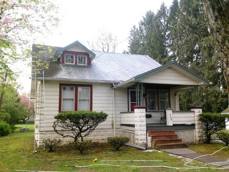 With our office (Pocono Non-Pressure Roof & Exterior Cleaning) based out of Delaware Water Gap, PA many calls come in from Stroudsburg, which is the next town west of us. This home located on Brown Street had it's roof covered in thick heavy moss, lichen and black algae. Our technicians applied our specially formulated detergents to clean the roof of black algae and halt the existing growth of moss and lichen.