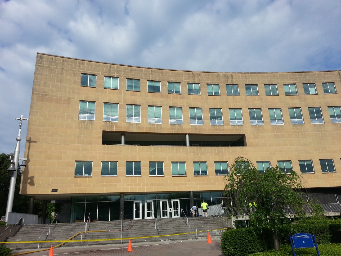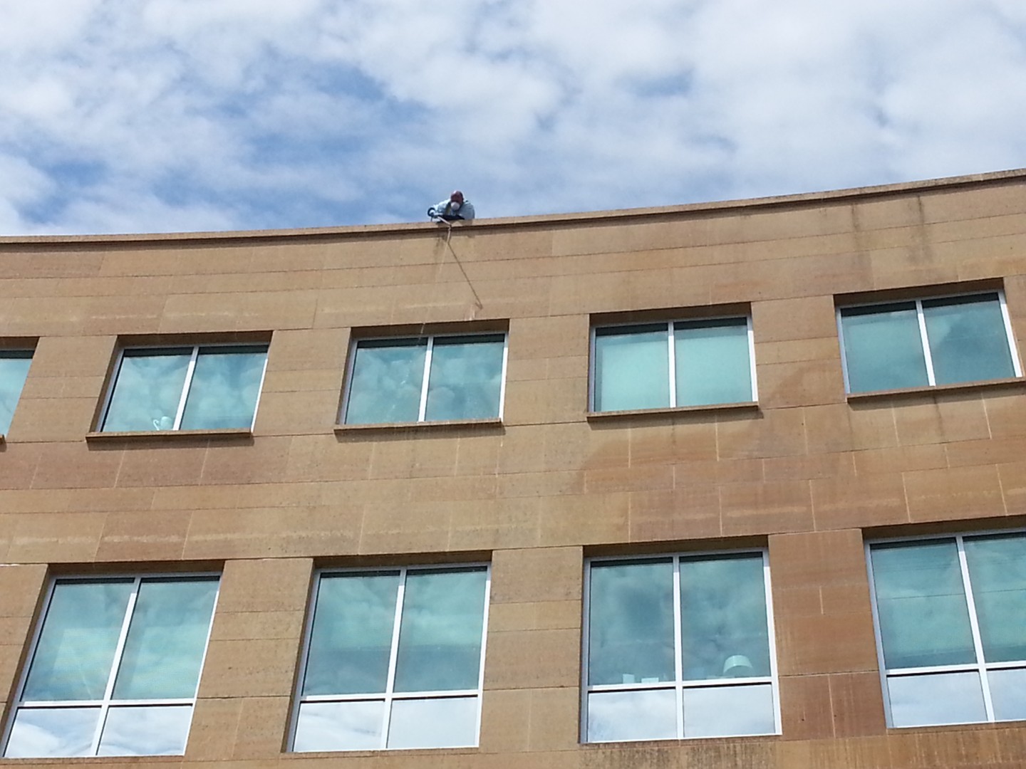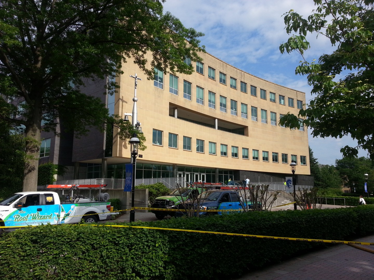 The Roof Wizard was contracted to clean the front side of Jubilee Hall at Seton Hall University. The building is a main focal point in the large wheel spoke courtyard and is seen from all angles of the main campus courtyard. It stands a total of 7 stories high, with two floors partially underground, with half exposure. The material was mostly sandstone based panel, with some natural granite panels also. One of the major logistic hurdles was that the use of a lift was not permitted. Also, the school had other bids for pressure washing, that were going to take 3-4 days to complete. The bulding is active and had people in and out all day, so the faster the better. Once The Roof Wizard explained that our process would take a day or less, it pretty much sealed the deal. We were on site thismorning at 8:00 AM and were pulling out at 1:00 PM. Five hours total and they were so impressed, we signed a contract for the Library as well, which is three times the size.