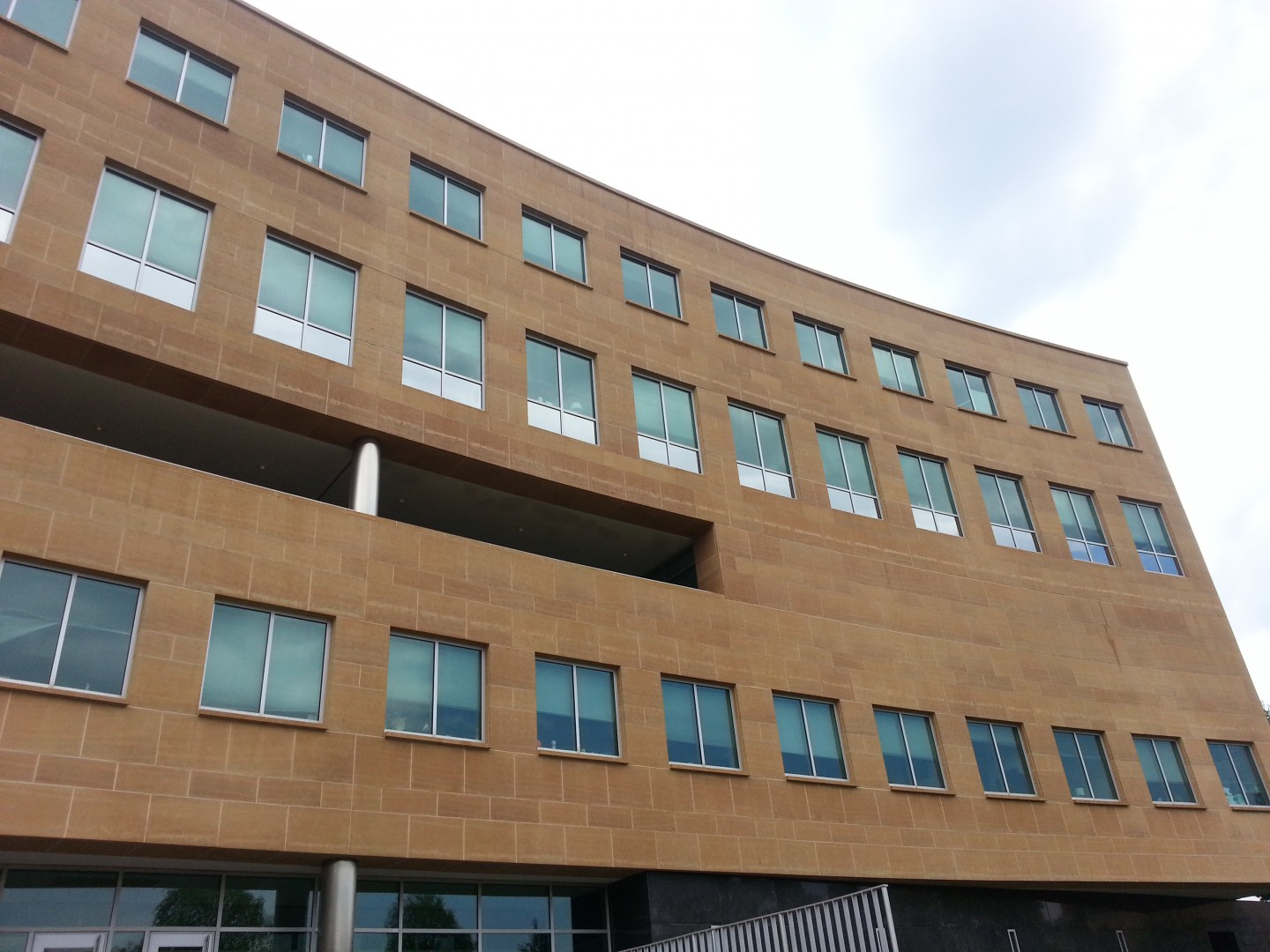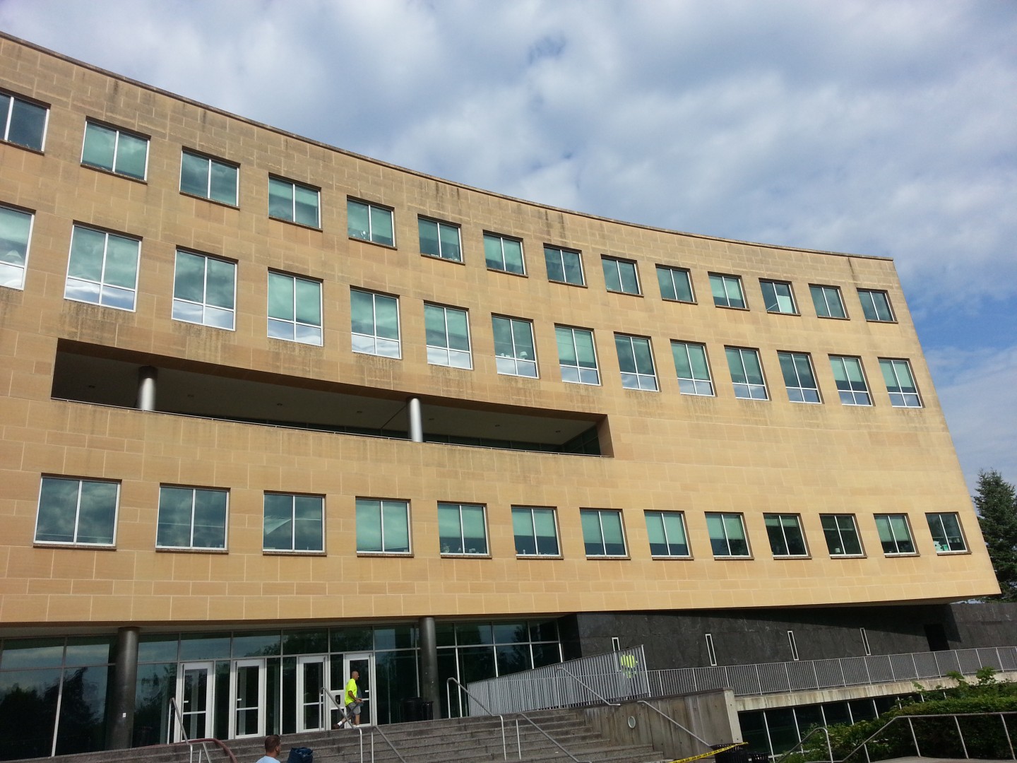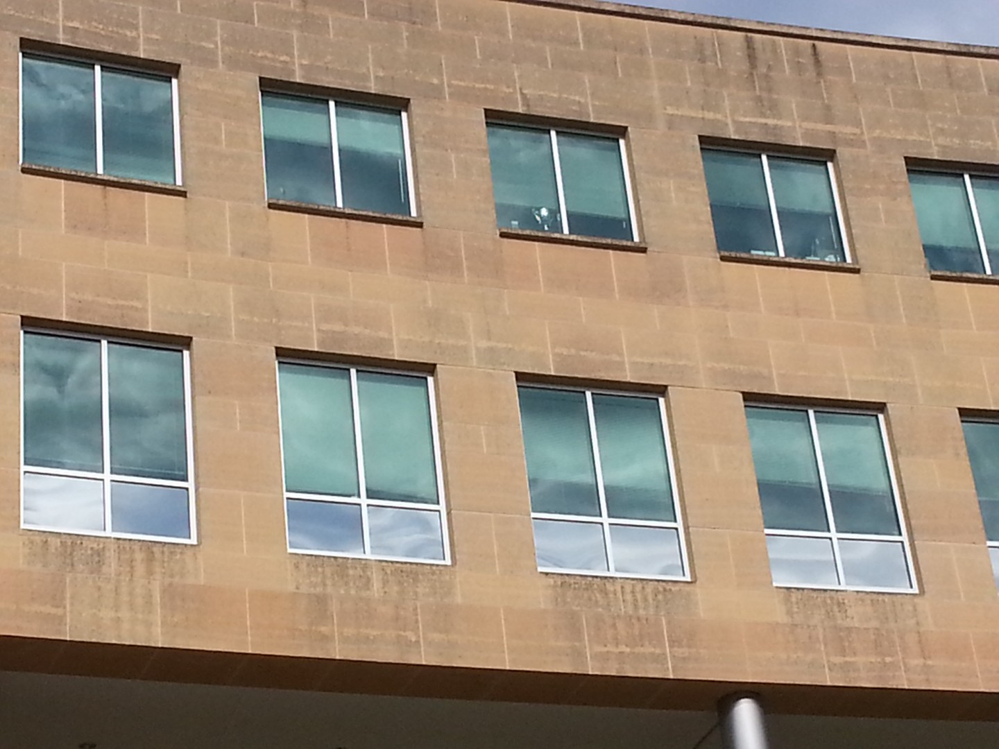 The Roof Wizard was contracted to clean the front side of Jubilee Hall at Seton Hall University. The building is a main focal point in the large wheel spoke courtyard and is seen from all angles of the main campus courtyard. It stands a total of 7 stories high, with two floors partially underground, with half exposure. The material was mostly sandstone based panel, with some natural granite panels also. One of the major logistic hurdles was that the use of a lift was not permitted. Also, the school had other bids for pressure washing, that were going to take 3-4 days to complete. The bulding is active and had people in and out all day, so the faster the better. Once The Roof Wizard explained that our process would take a day or less, it pretty much sealed the deal. We were on site thismorning at 8:00 AM and were pulling out at 1:00 PM. Five hours total and they were so impressed, we signed a contract for the Library as well, which is three times the size.