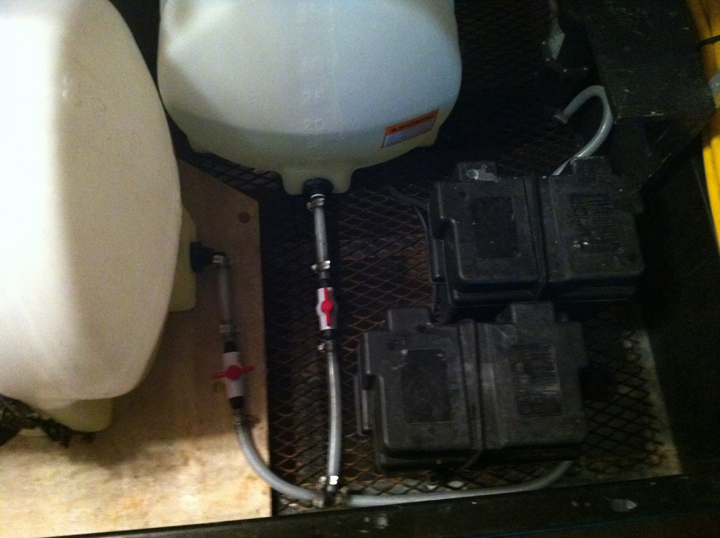 I finally added a flush tank for the purpose of flushing out the system with fresh water at the end of the day. Previously I would transfer the draw tube from the chemical tank to a 7 gallon container of fresh water and flush the system out by spraying back into the 7 gallon container. Now I added a 35 gallon tank for fresh water, removed the draw tube from the chemical tank and instead connected the pump inlet to the chemical bulk head and added two valves. I also installed an in-line filter. So now to flush, I close the chemical valve, open the fresh water valve and spray into the fresh water tank. At the beginning of the next day, I pump the used flush water into the chemical tank and replace it with fresh water ready for the next flushing.