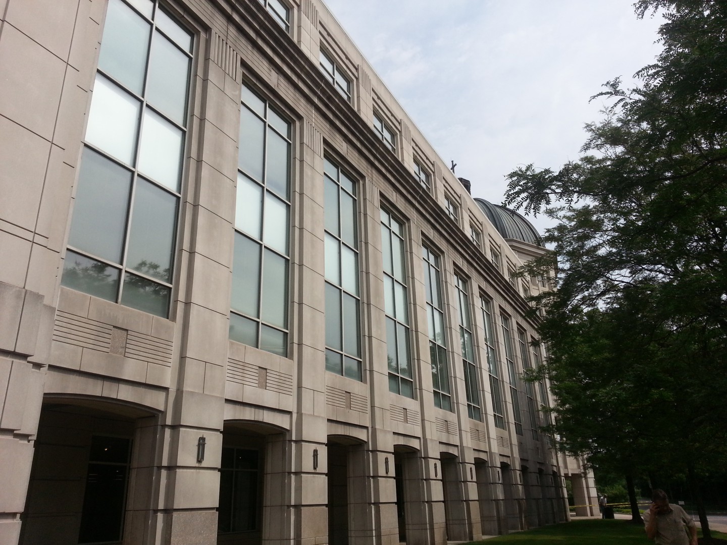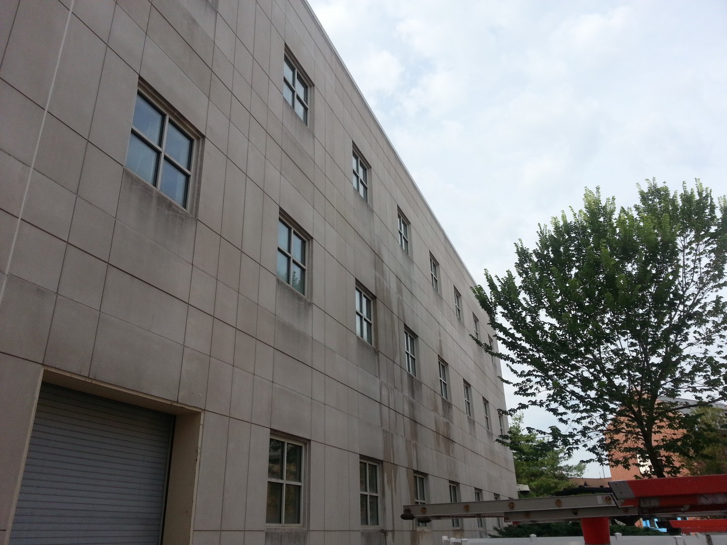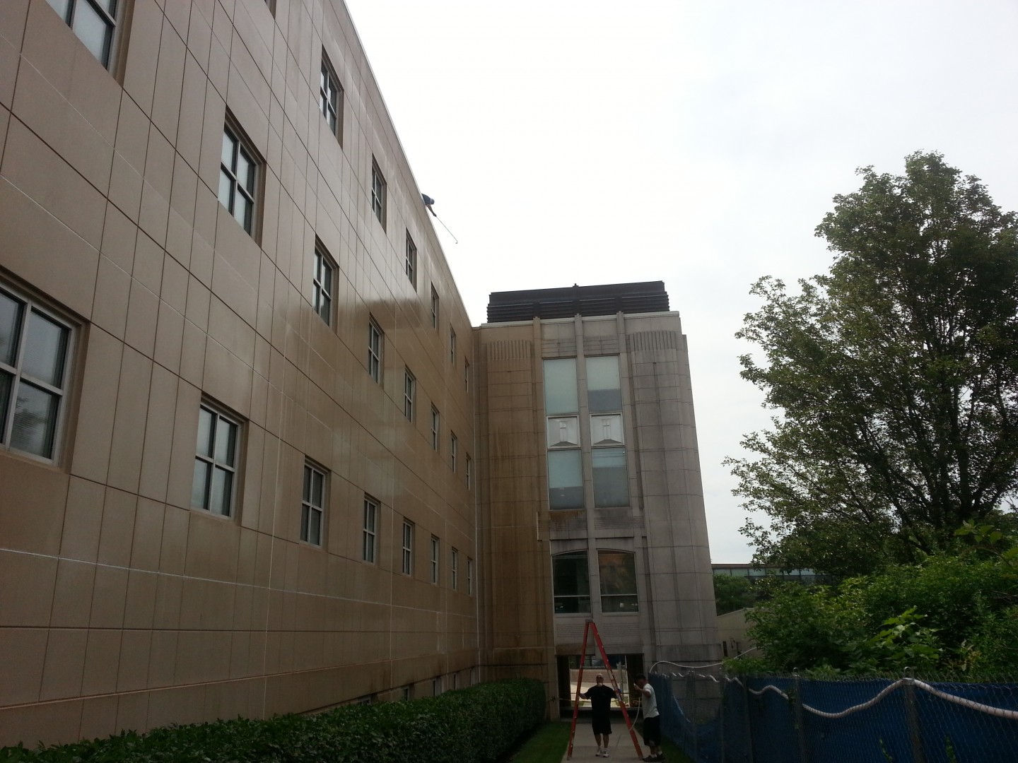 The Roof Wizard was contracted to do it's second building at Seton Hall U. recently. After completing Jubilee Hall in less than 6 hours, and causing minimal disruption to the busy University, they asked if we could do the same for the very busy Walsh Library. This job was a little more complex than the first. The building is the Campus main library, houses the only Dunkin Donuts on campus (with an outside seating corridor area), is open 24 hours a day, and is the hoome to the Freshman orientation (Which just started the beginning of this week). It is a precast structure that has not really had a good bath in 20 years. It measures just over 220 feet long per side, with numerous bump outs and cut ins, it is four stories high in some parts and 5 in others, and has ornamental ledges, cornice and molding all around it. Extreme caution had to be taken around the copper dome, which stands over 100 feet tall, as to not remove the years of patina from it. We were able to complete each side in an average of 2.5 hours per side, with set up and take down three different times. We had permission again to rinse with the use of the fire hydrants and fire hose, which pumps out 160 gallons per minute. Being able to get in and out in a day and cause minor disruption to this University has secured more work for the future. There was an absurd amount of traffic in and out of the building all day, which 3-5 of our crew had to constantly stay on top of and funnel away from the chems. We went through about 300 feet of caution tape and a countless amount of cones. We went through 310 gallons of SH and just under 1000 gallons of mix.