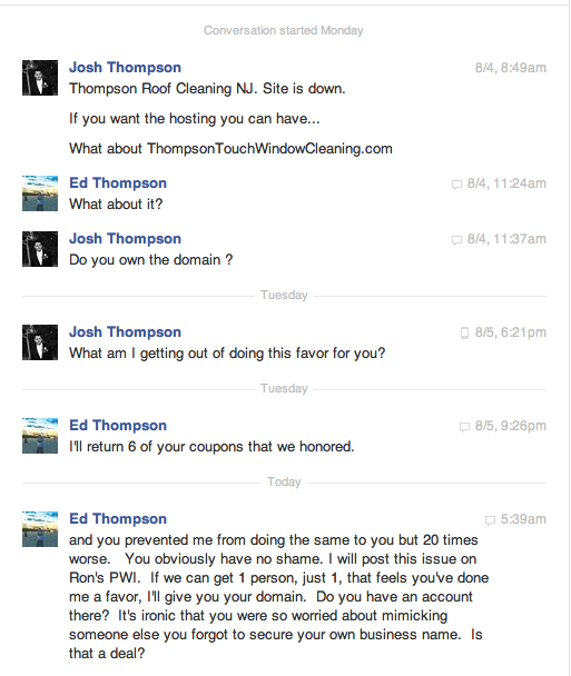 Doug, you set a bad precedent by doing that. If the norm becomes that you have to retrieve the domain from some dik wad everytime he decides to create a mimicking website, you'll find yourself chasing your tail. It's like black mail. In a way that's what this douche bag is doing now. His original intent was to be found on the merits of OUR good name, not his. I called him out. The right thing to do would accept that he made a jerk off move and got on with his life. But now he wants to parlay the results to his benefit. He wants his domain thompsontouchwindowcleaning.com. Isn't ironic how he failed to secure his own business name while he's out trying to copy others?