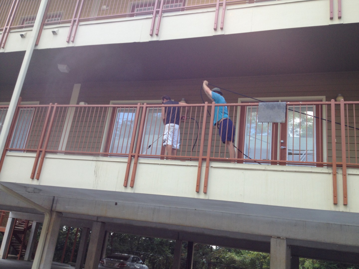We typically do these during the summer season but the new management company couldn't get paperwork together and is having is clean . in the middle of the fall semester. These are sweet style apartments, they only have one door per-unit can't even send people around to the backside to come in and out. Suffice to say its a pretty difficult job under full occupancy conditions. We've actually opted to do more pressure washing than soft washing and really limit our bleach use here... Just too many people, bad parking, the list goes on!