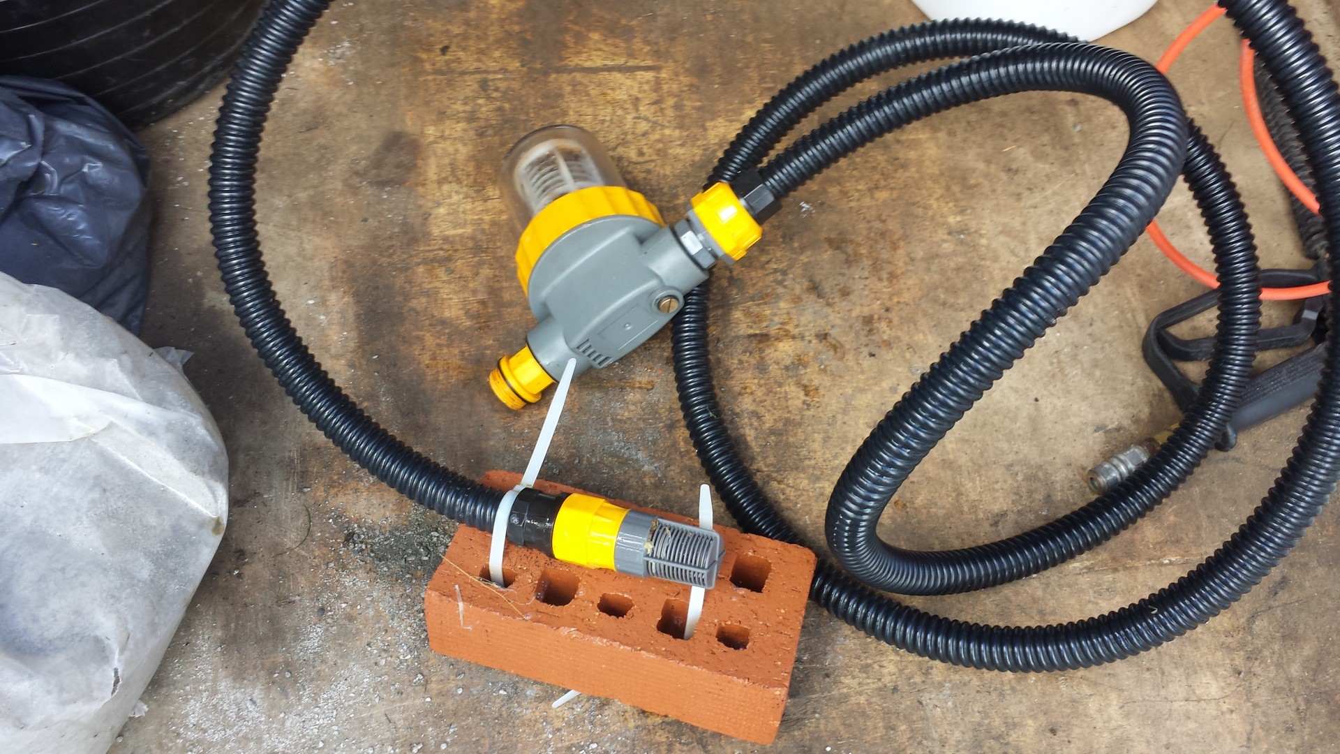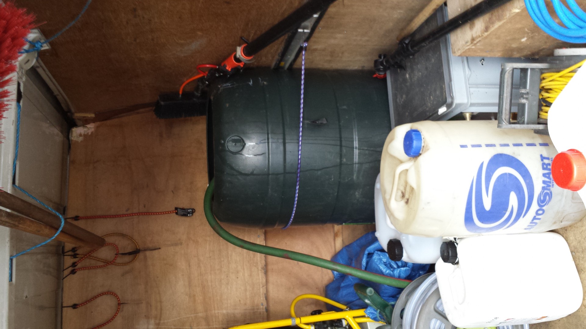 so gets my 200ltr barrel 50gl fills it drops in ten lts SH 12.5 to mix a 5 % mix and some surfactant in as well lemon then pumped it through my little pump using 3/4 clear braided hose ball valve at the end and a bit lance pipe just to use as a aim for the end of the hose