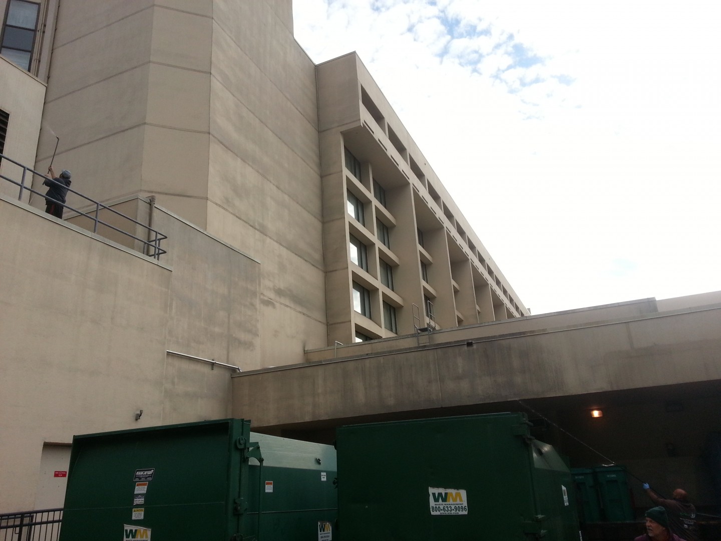 The Roof Wizard was contracted to clean this Marriot in Hanover/Whippany, NJ, this past week. The project was a challenge with the hotel being extremely busy and booked out solid every day. The building ranges from 8-11 stories and only a lift could be used on one and half sides. All the other sides are surrounded by the 20,000/SF conference center, which also was booked solid. We softwashed the entire building Monday, Tuesday & Wednesday which put us a day ahead of schedule. The hardest part was dealing with the extreme wind, rain and 48 degree weather on Wednesday. The surface was a Siloxane coated EFIS, which was infested on two sides pretty bad. The hotel management had two other quotes from local pressure washers, who said the project would take a minimum of six days, and they could not assure them that the coating would not be damaged.