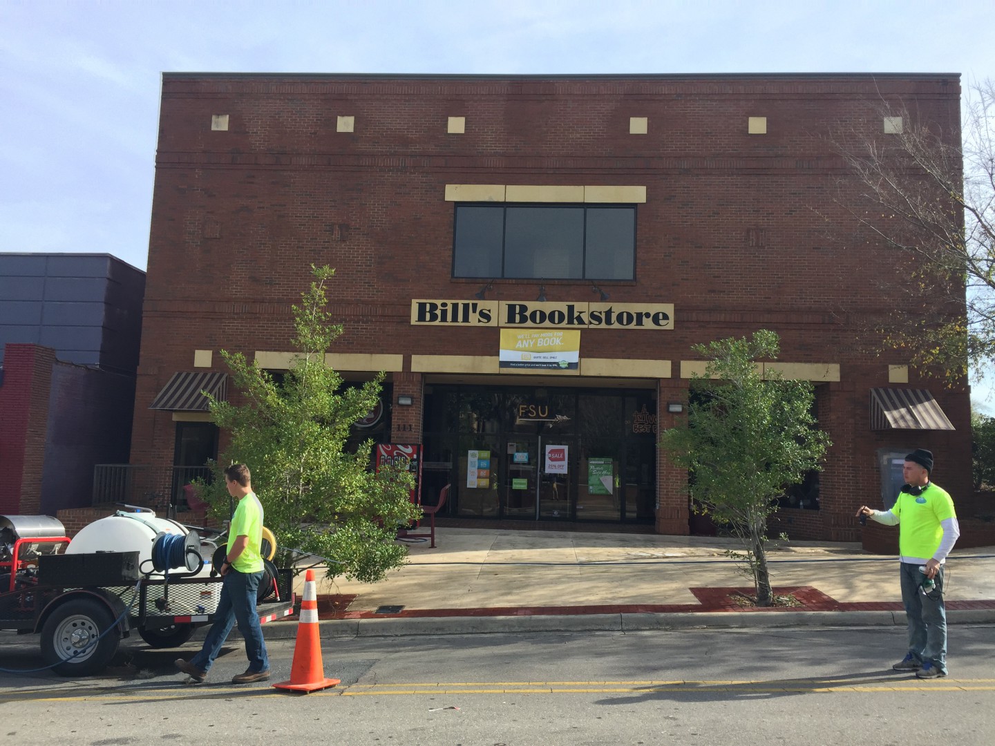 we are taking advantage of the New Year's holiday and the reduced vehicle and foot traffic to clean " Bills bookstore " which is a Tallahassee landmark! Located directly across from the main gates of Florida State University, this can be a very difficult area to wash due to lots of students, narrow sidewalks, and crazy student schedules.