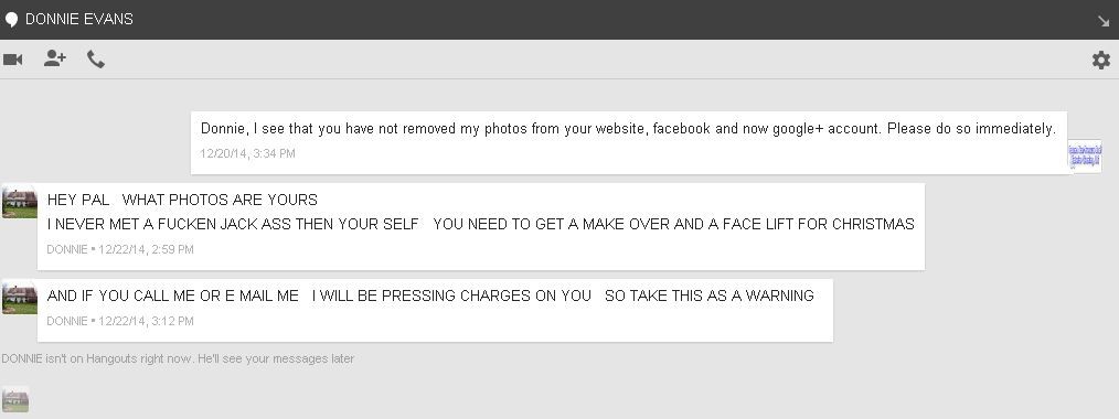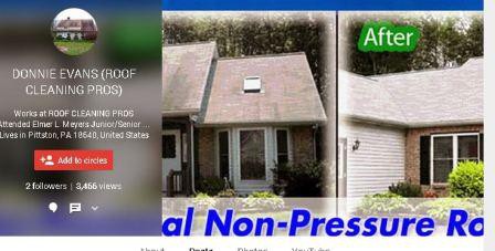 This guy Donnie Evens of Roof Cleaning Pros/Pittston PA pulled photos of our work off of various sites including my own and he used them on his website, facebook and google+. I asked him politely to remove them. Before he did he sent me this message(first photo below). The google+ photo was taken right from the header of my site. Since then he has removed my photos but is still using photos that belong to Danny of Apex Soft Wash among others. In Danny's case he has ignored messages from Danny. He trying to service areas up here and is a competitor to both Danny and I.