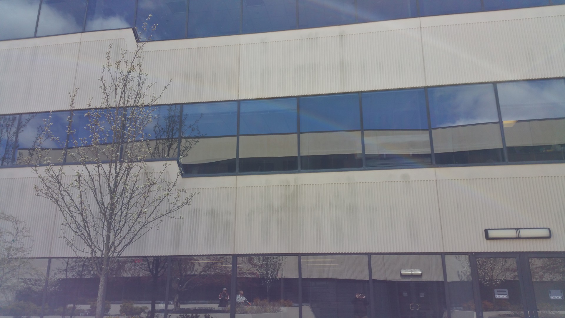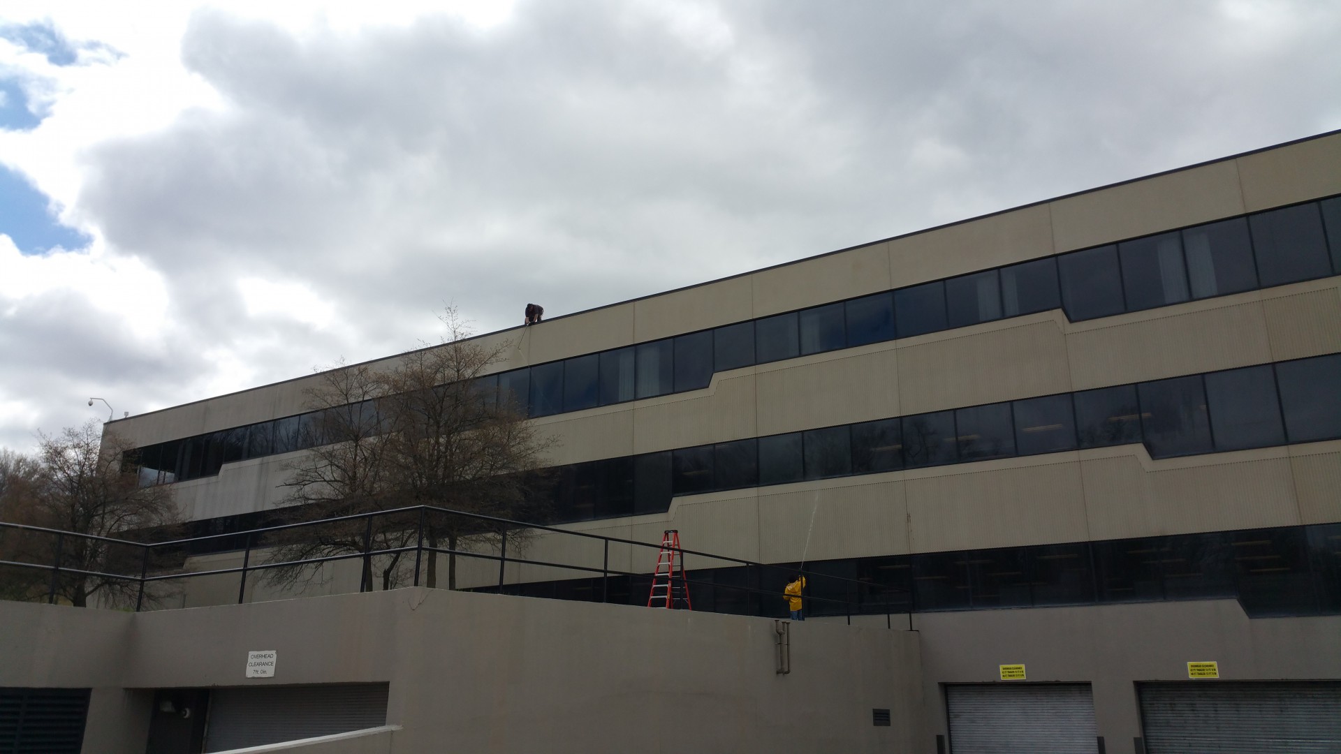 This week the Roof Wizard's Crews softwashed a corporate office HQ, for Verizon. It was cold, and extremely windy, but we were able to get the project scope of work done in one day. The building was fully functioning and had approximately 1500 people in and out all day, including deliveries to the loading dock and an entire army of Verizon Corporate Officer's in for meetings. It was probably our most difficult job to date, with respect to pedestrian and auto traffic, and dealing with a constant 25 MPH wind. They are having a Corporate party for all the Verizon big wigs here next week, in the courtyards, and wanted the building to shine. We used a 2.5-3% mix with Green Wash and the results were terrific.