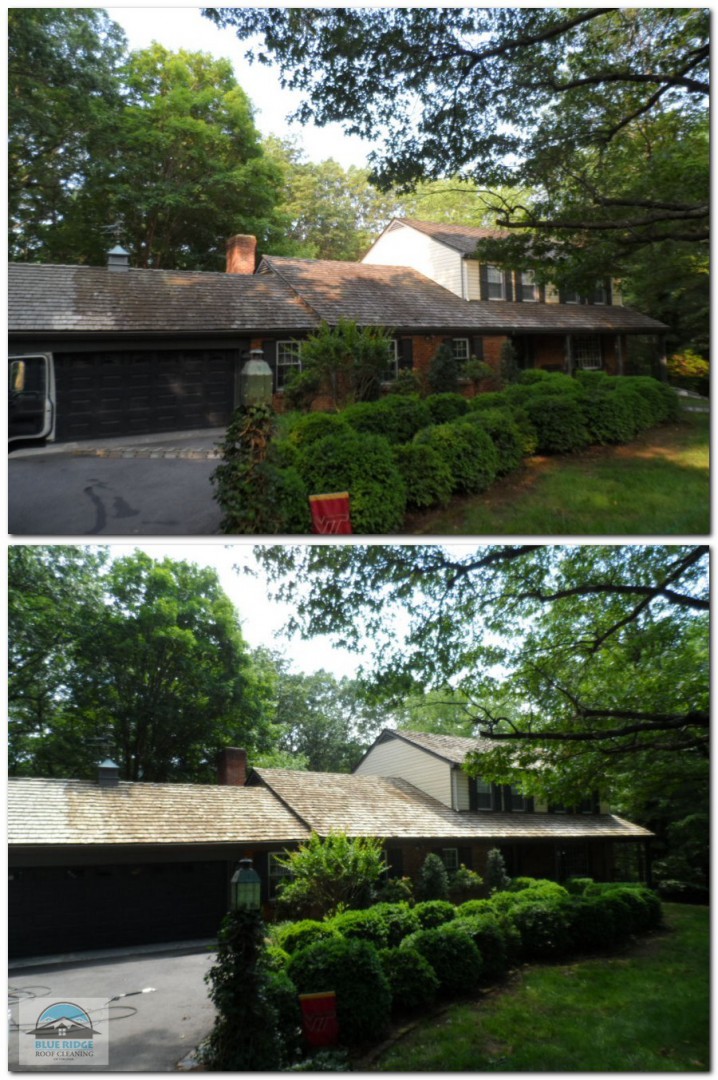 We were called by this home owner because he had a cedar roof that was covered with algae. Fortunately he decided to have is cedar roof cleaned before the lichen and moss started to take over. This job was a bit out of our normal work area but he did his research and found that Blue Ridge Roof Cleaning of Virginia was the company to carefully clean his roof. Three of us worked to get it done in a normal work day and added one more happy customer to our list.