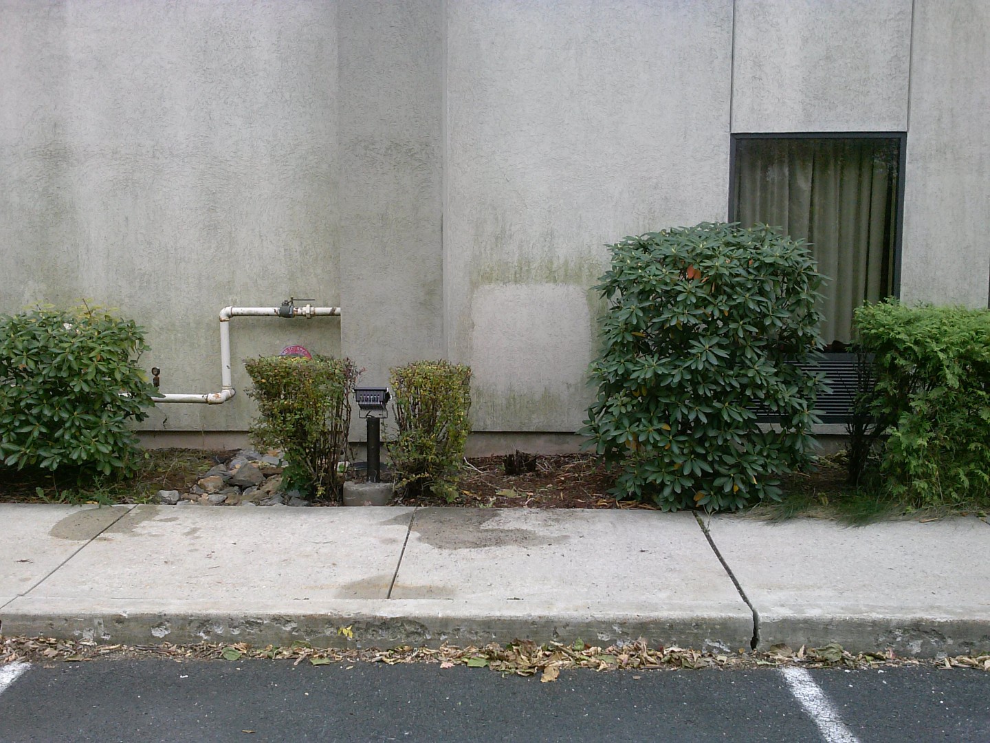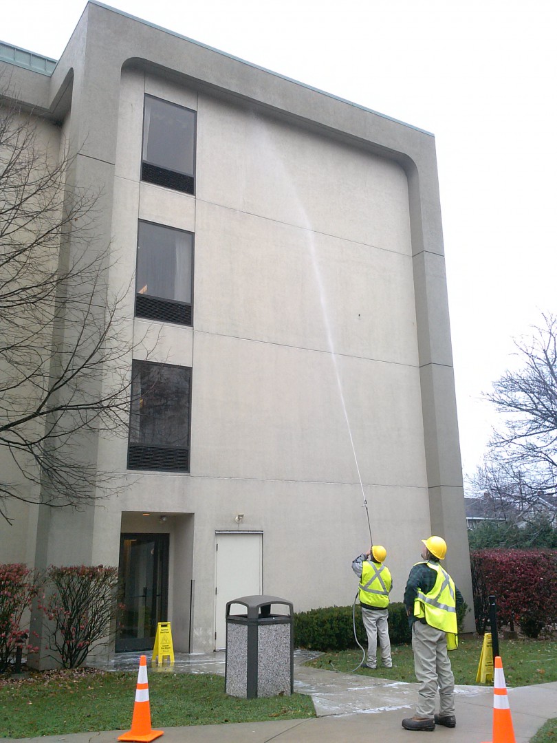We were able to shoot most the building using our shooter tips and downstreaming. Several areas that had hardie stains needed our mjet. On the sidewalks we used just the surface cleaner.
