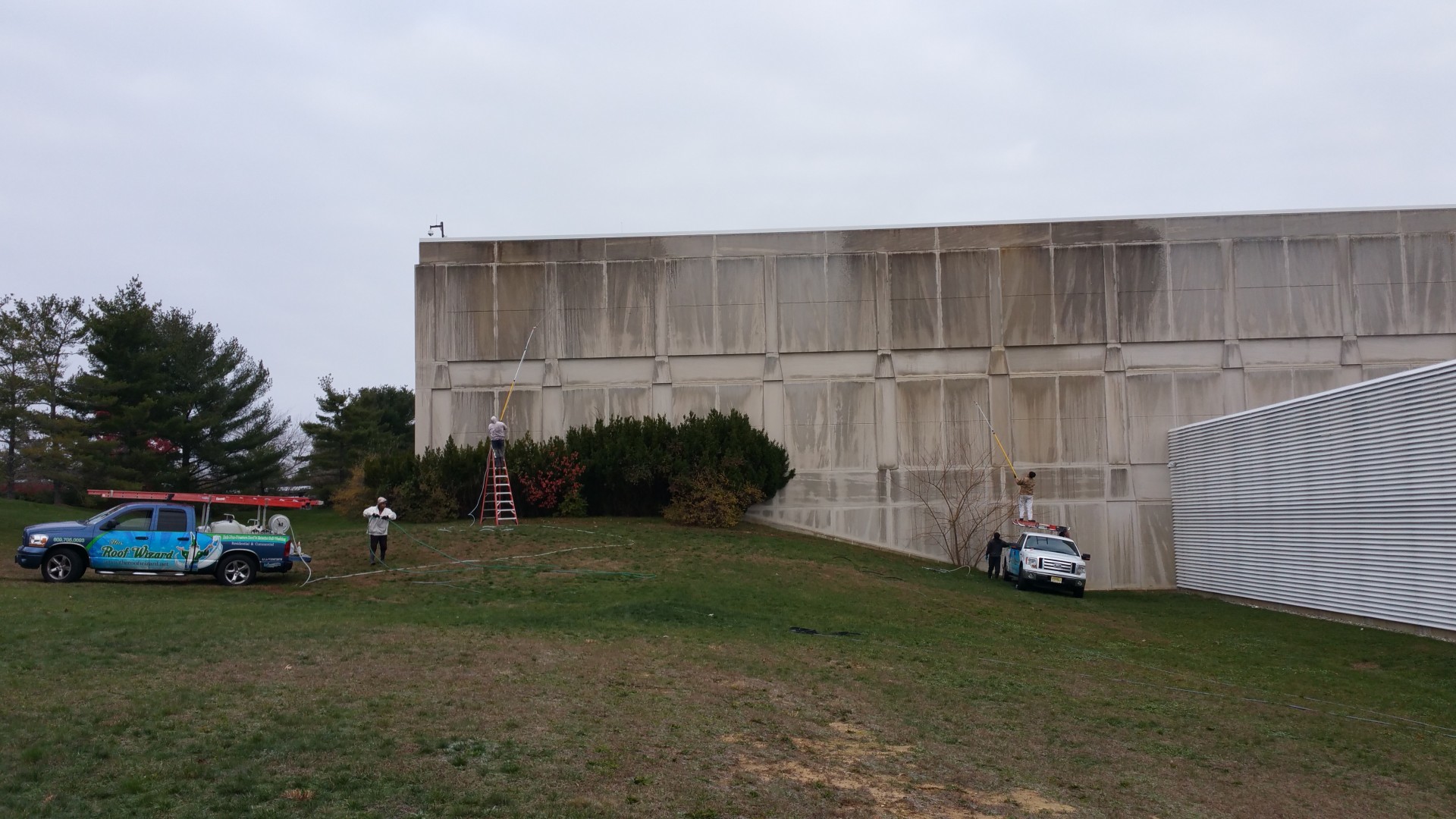 Thanks Maverick. We softwashead the building. Those guys are only using those poles for two reasons....one of them was the wind,. It was blowing 25 mph, usually we can hit most three story buildings from a step ladder. Second, we usually use a carbon fiber pole for weight issues, but I has another crew on the other side of the job washing windows. i have three of those WF pole guns and we use them all the time for high house washed. For roofs we have used them for hard to get areas on non walkable roof.