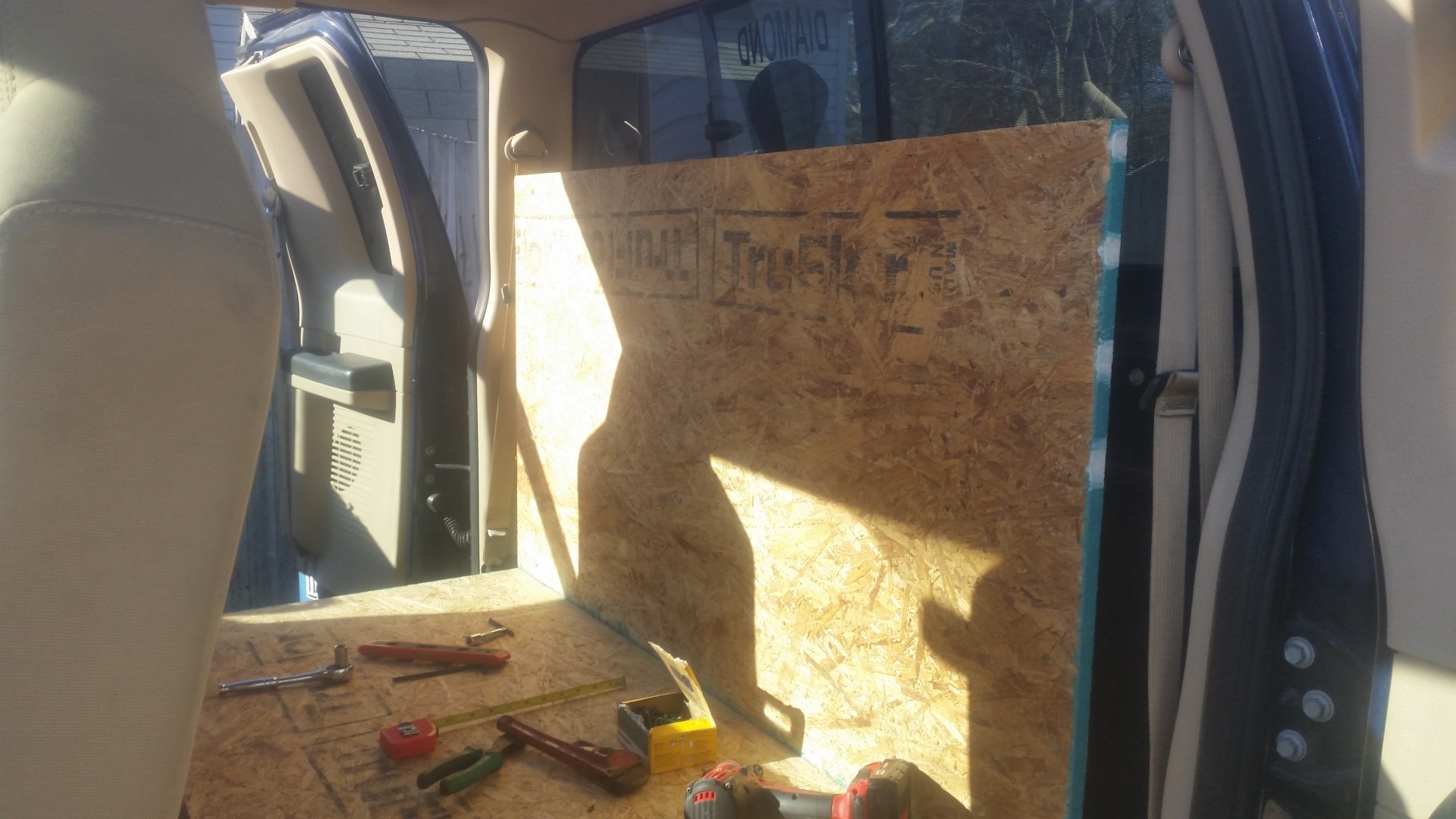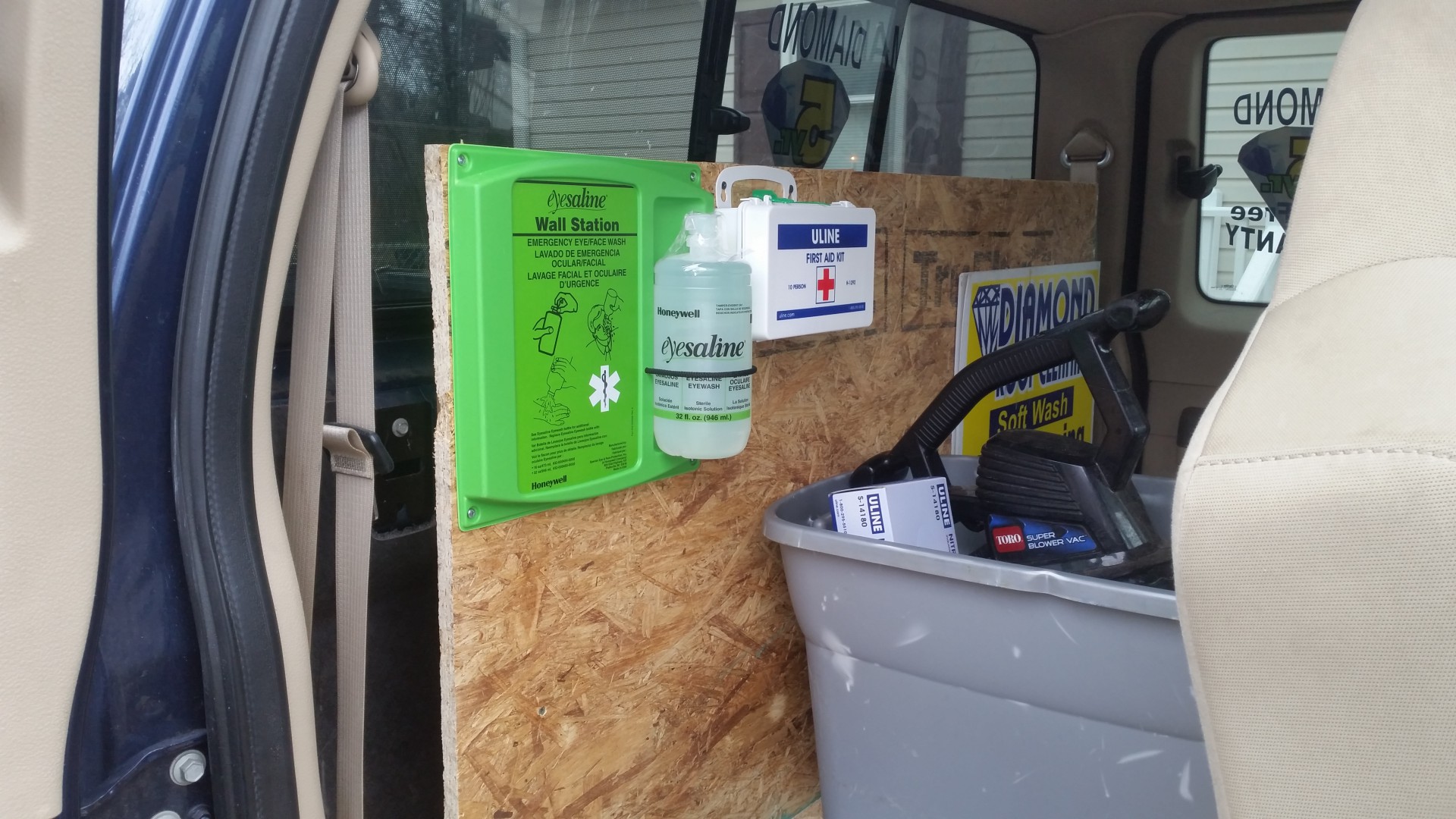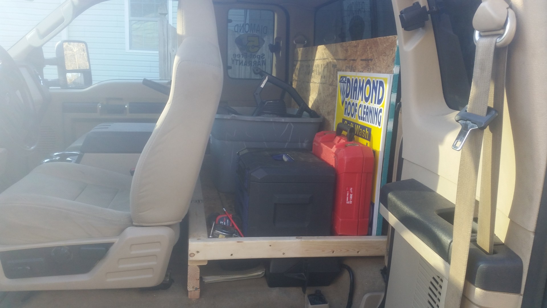 So with the last couple of nice days I decided to remove the back seat of my f250 and build a platform. This will allow me to carry more containers inside bins and I will be installing an eye wash station and first aid kit on the Passenger side. On the drivers side I will be installing a bin for paperwork and a rack for my window cleaning pole.