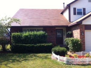 This house with its bushes and charming flower bed with a white fence around it would have really nice curb appeal if it wasn’t for those dirty black steaks on the roof. When looking at the landscaping and front of the house, one cannot help but be distracted by that darn roof! For the rest of the story and a happy ending, go here.