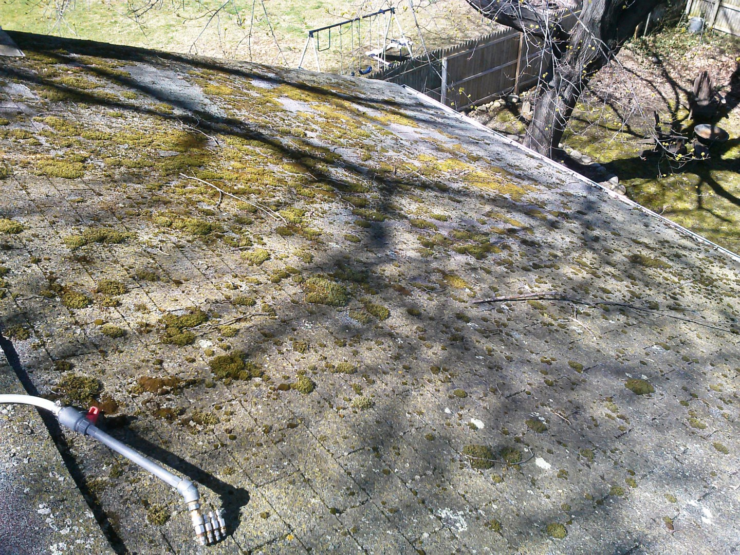 As can be seen in these photos the roof suffered an infestation of heavy moss, lichen and black algae. Using our specially designed commercial grade roof cleaning equipment we were able to eradicate this roof of black algae and halt the existing growth of moss and lichen.