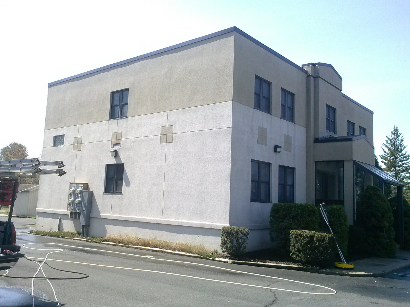 As the leading provider of commercial pressure washing in East Stroudsburg PA we were contacted by the owners of this commercial property on Mill Creek Rd to remove the black algae that developed on the sides of the building. Using our commercial grade truck mounted equipment we were able to deliver our cleaning detergents to the dryvit exterior finish without damaging the delicate substrate. As can be seen in the photos below the curb appeal was improved immediately and there may be an increase in the property value.