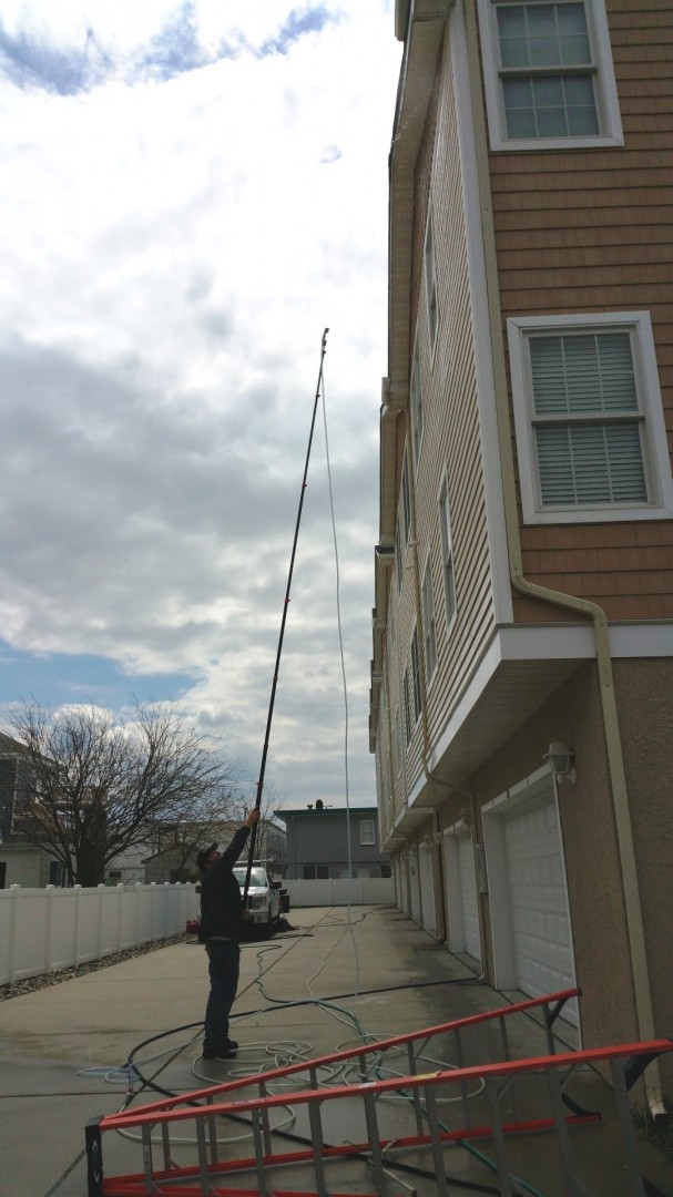 We use a SWS waterfed pole gun and a carbon fiber waterfed pole, see the pic attached. We have done up to 6 stories with this. But like everyone said....if the wind blows all bets are off.