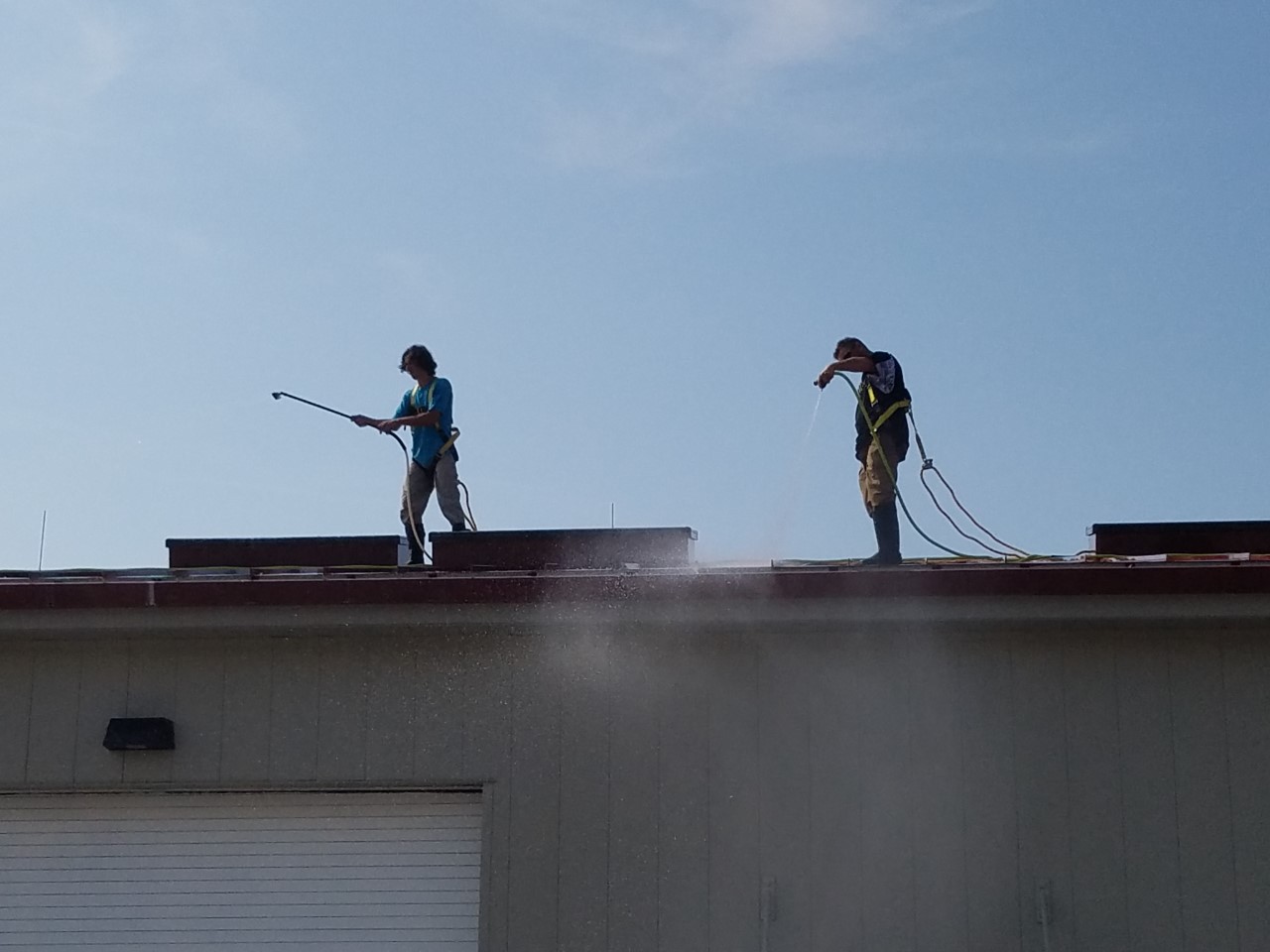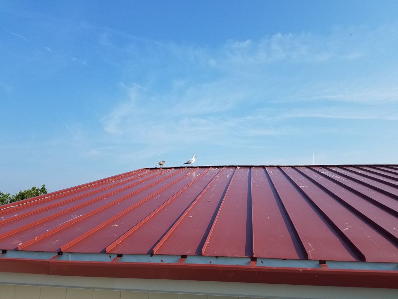The Roof Wizard crew cleaned this brand new metal standing seam roof and metal wall panels on the US Coast Guard training center in Cape May, NJ today. The building is only 3 months old, but the Seagulls have started to roost and leave behind some nasty presents. The roof had a good amount of pooh on it, and was cluttered with bones and shells. The seagulls pose a large problem with the roofs on this base, as we have been cleaning other roofs here for the last four years regularly. The metal roof manufacturer requires the roof to be cleaned, or the Kynar paint finish warranty would be voided. We have four more metal roofs to do this summer and the birds never stop making a mess. For this particular building the contractor, from Minnesota, had the cleaning in his contract as a punch list item.