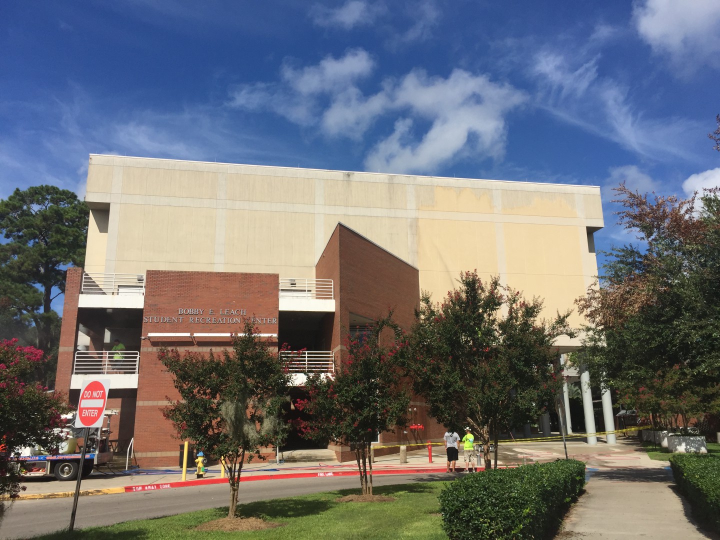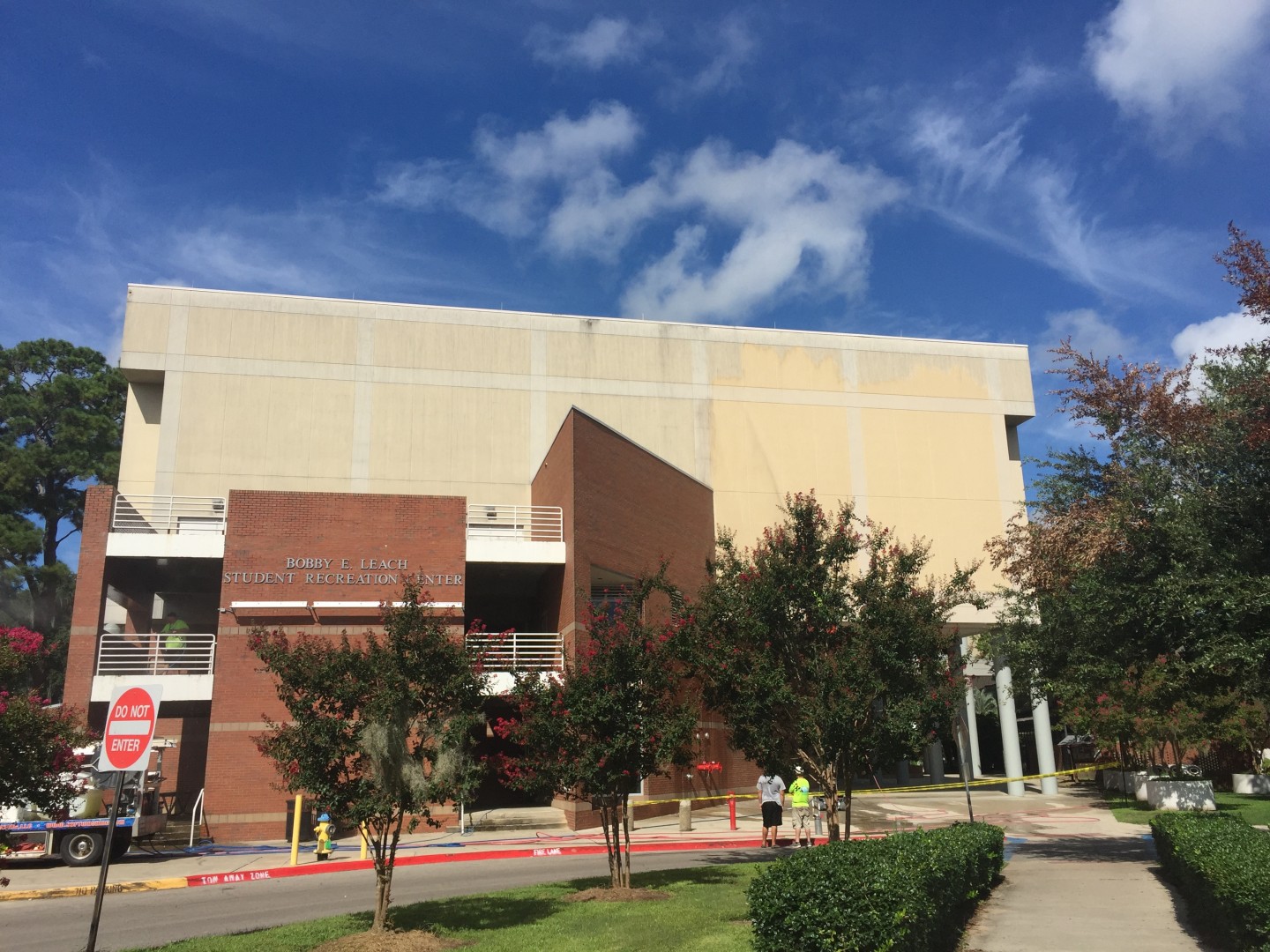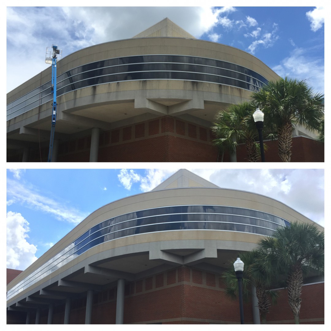 The Bobby Leach student life center is a large multi-purpose facility on the campus of Florida State University. It houses not only an elevated walking / running track, but also a Olympic size swimming pool stadium, large gymnasium, and other various athletic department. The exterior is brick and synthetic stucco and has not been cleaned in years. Soon FSU will be celebrating the 25th anniversary of this complex and and preparations for the party they're having it cleaned. Spray Wash Exterior Cleaning had the honor and pleasure of undertaking this project, and we think the results.... Well let's just say a picture is worth a thousand words!
