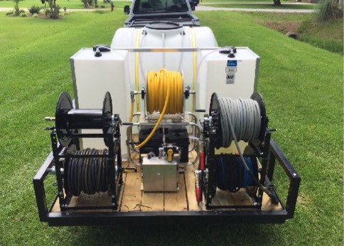 - roof cleaning system with titan hose reels, battery, 12v pump, kuri tech hose, gun, nozzles etc