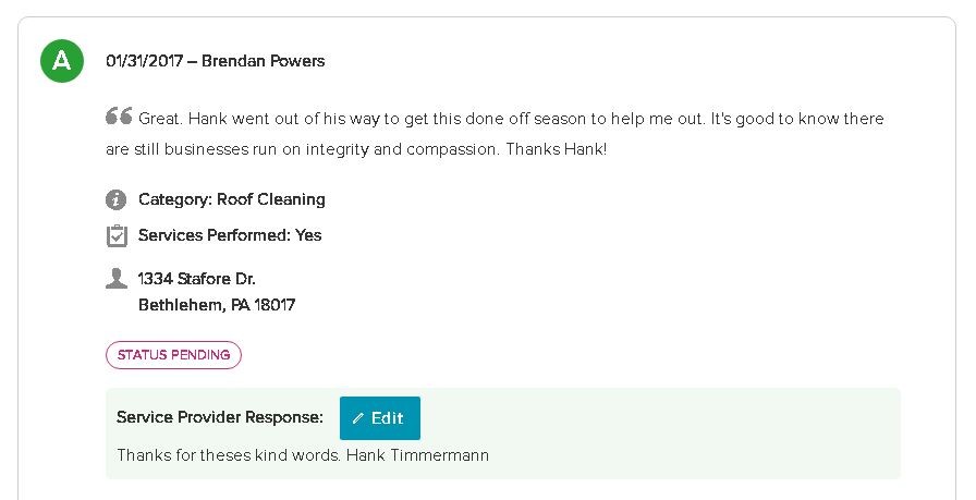 Like many customers before them and can be seen below our customer left us a great review on Angie's List. The fully trained and insured staff at Pocono Non-Pressure Roof & Exterior Cleaning pride themselves are completing all work on a timely basis with little to no disturbance to your way of life.