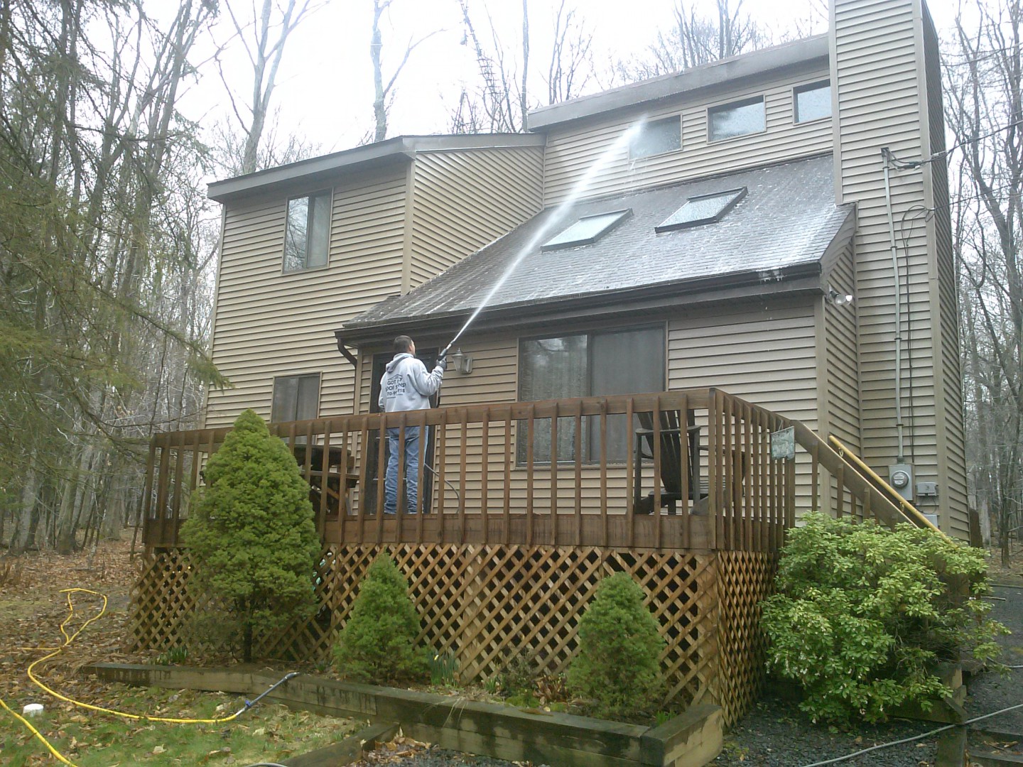As the leading provider of roof cleaning throughout the Pocono region we (Pocono Non-Pressure Roof & Exterior Cleaning) provide our services to both Monroe and Wayne County PA residents. This homeowner called us to prepare his house for an upcoming sale. The home located in the private community of Big Bass Lake was serviced by us on 4/20/17. Our services included roof cleaning, soft washing and deck cleaning. The roof cleaning removed all black algae from the roof and halted the existing growth of moss and lichen. Our soft washing of the exterior vinyl siding removed the green algae and cobwebs around the home. The deck was cleaned to remove the slippery algae on the deck boards eliminating a potential slip and fall issue.
