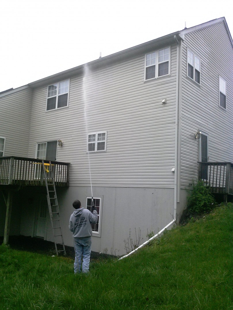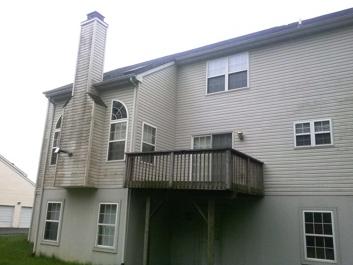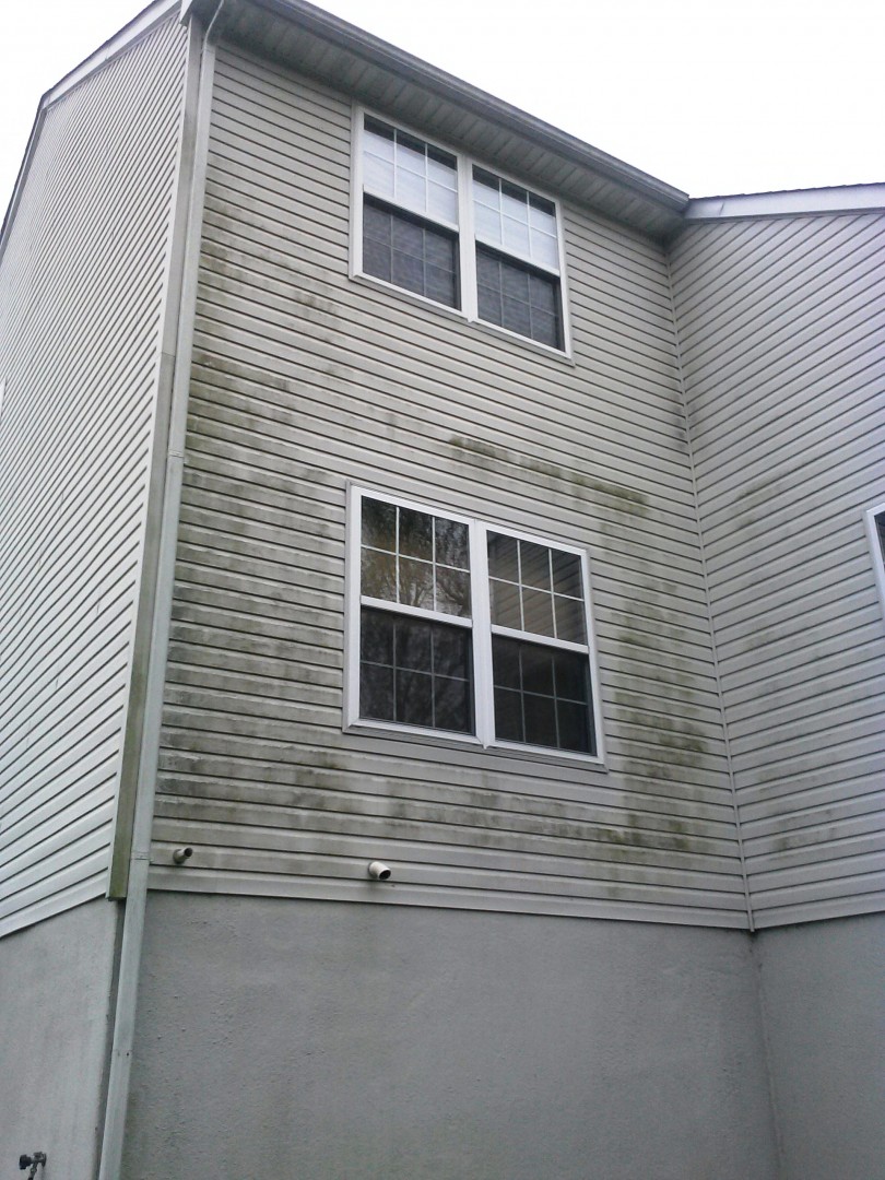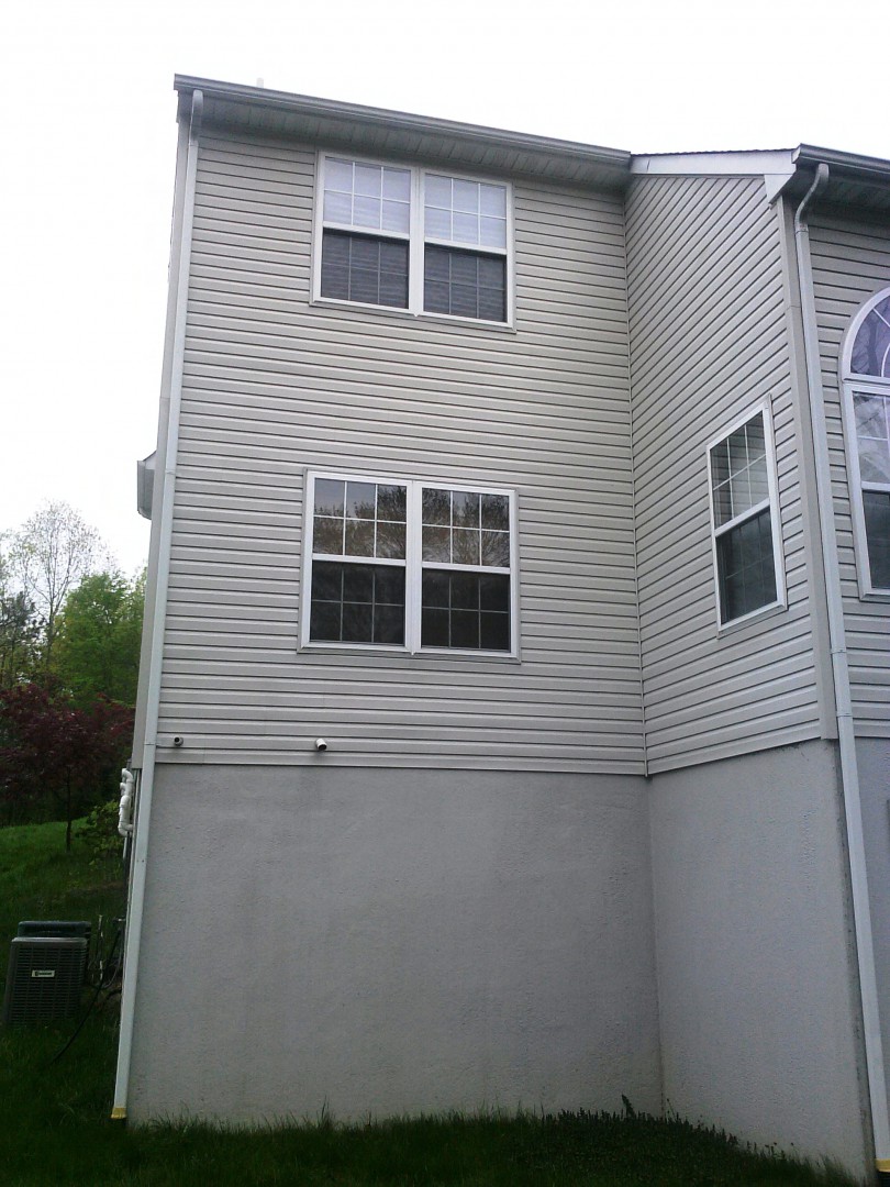 Is your vinyl siding looking like this? These new homeowners in County Club of The Poconos wanted to get the place cleaned up before Memorial Day weekend so they contacted Pocono Non-Pressure Roof & Exterior Cleaning to provide them with results. As a result driven company we cleaned the vinyl siding, dryvit(EIFS) and deck. The results were immediate using our soft washing methods. As can be seen the photos below all algae, dirt and oxidation was removed in an effective and safe manner from this three story structure.