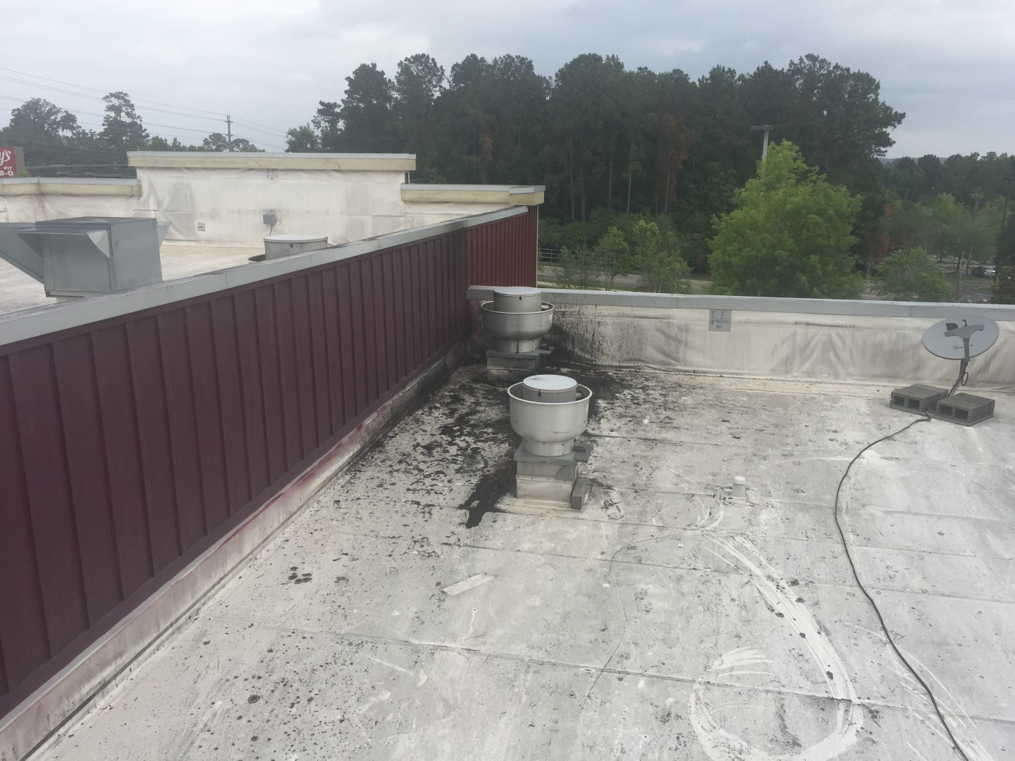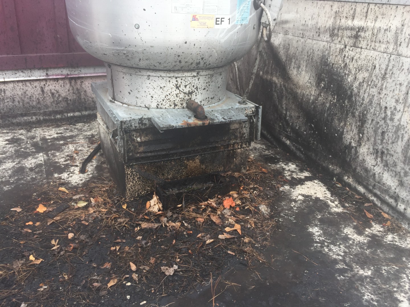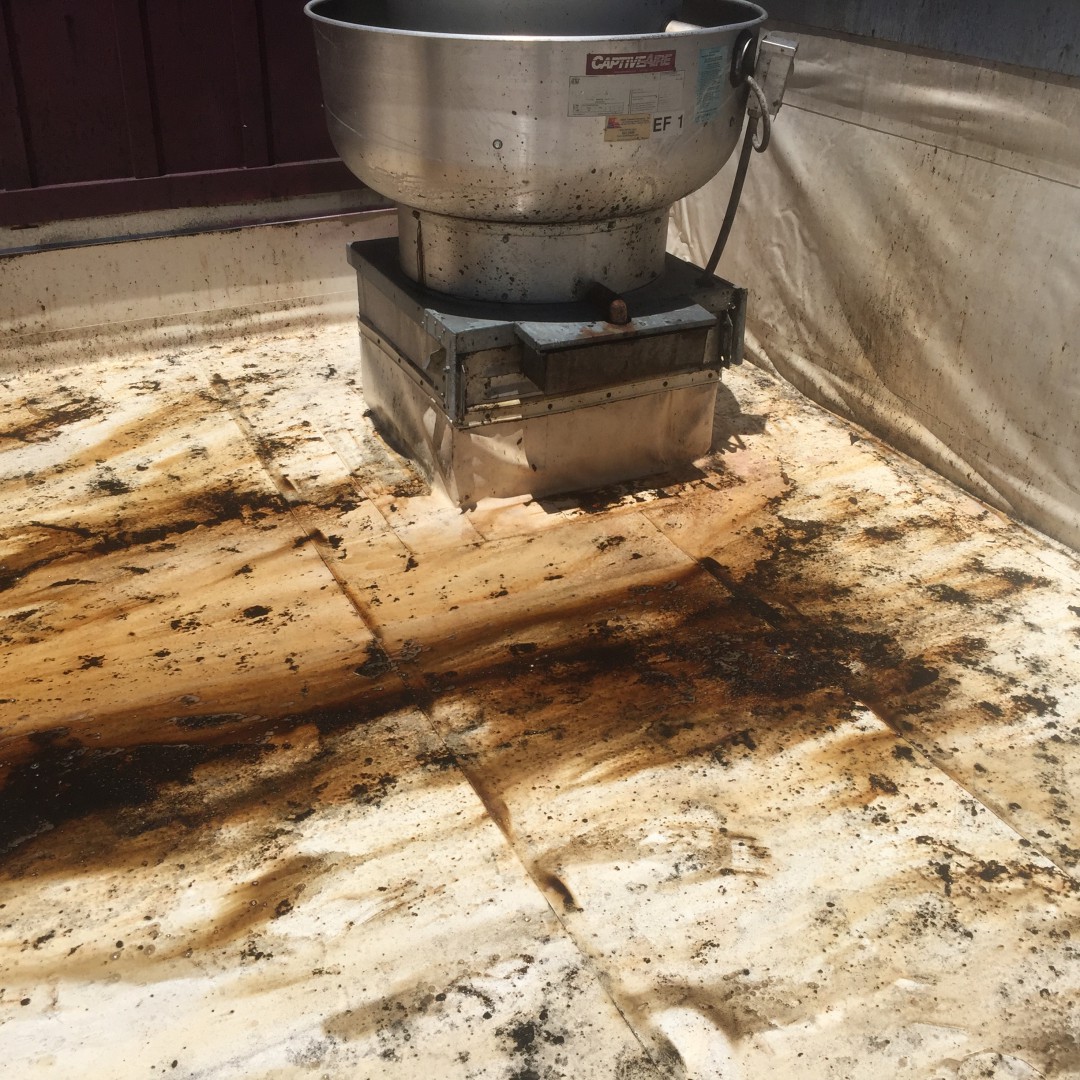 We were approached by a roofer to clean this TPO (membrane) roof at this local eatery. The hood cleaning company had obviously not been performing a proper and thorough cleaning for quite some time and the grease catch basin was not even attached to the fan system, allowing vented oils to spill on the roof. Leaks had formed inside, and the roofer was unable to even diagnose the issue unless the roof was either cleaned, or removed and replaced.