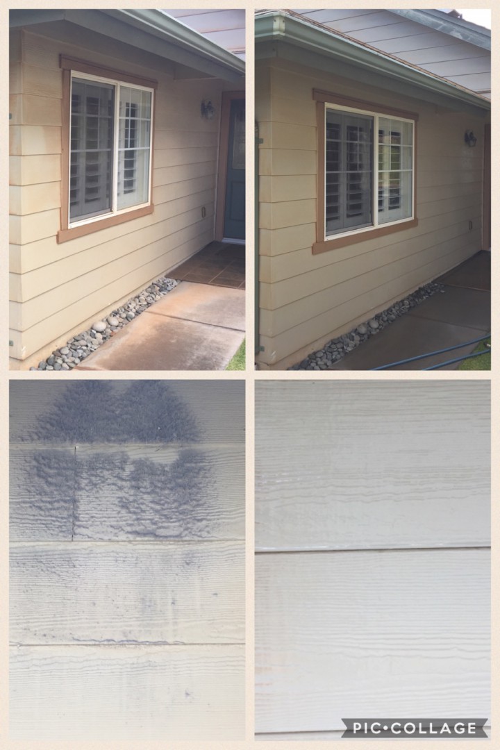 Aloha everyon! This house we did today was a real pain! We removed most of the red dirt but as you see a lot of it is stained into the aluminum sidining. This was a hand wash job with mits and Softwashing also. We also pressure wash the surrounding concrete surfaces