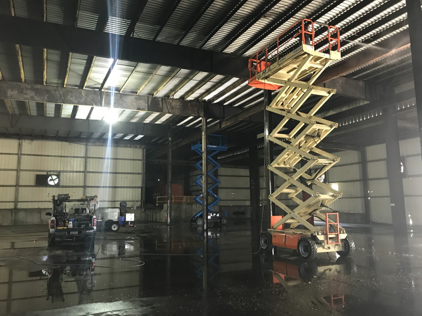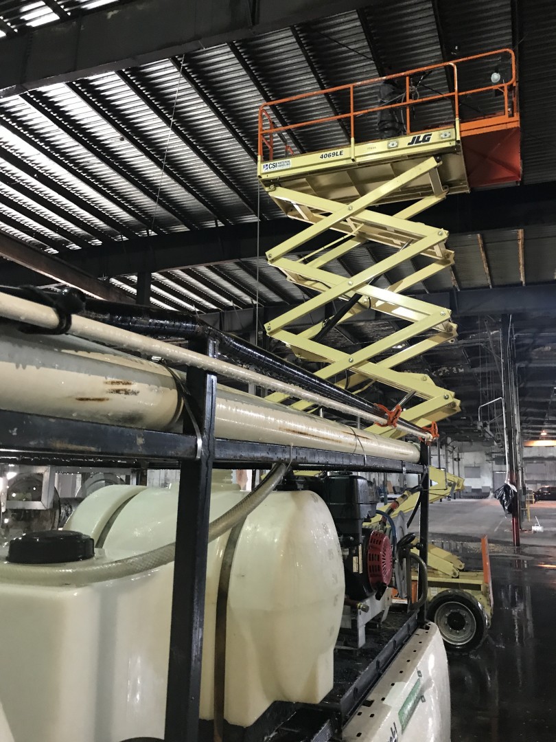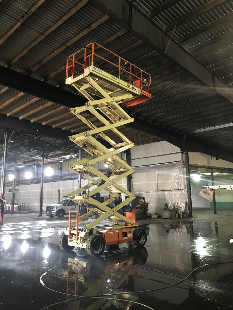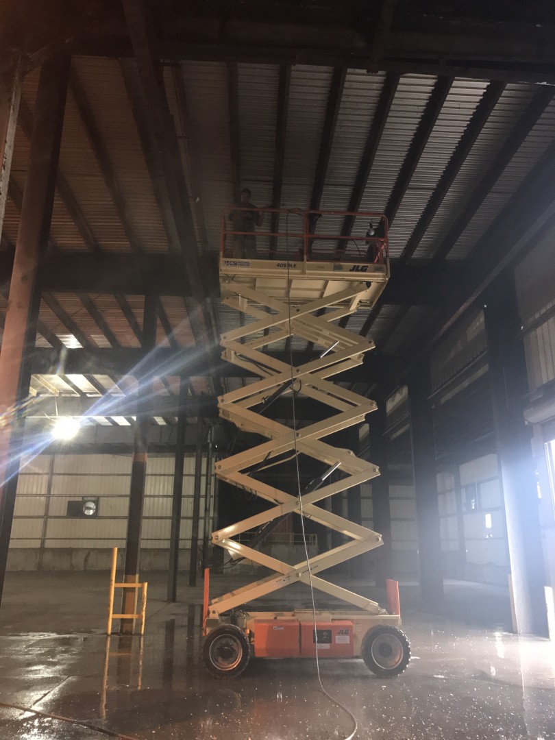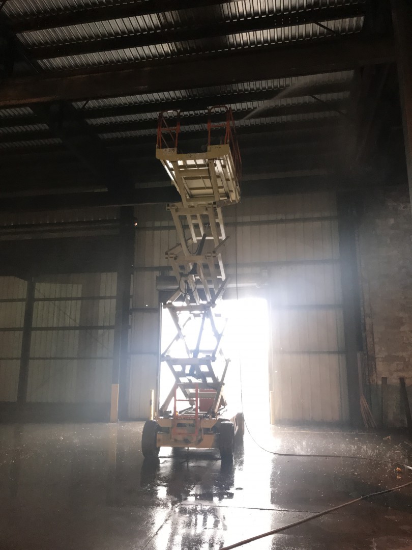 This is our new project (promo post to follow) we just started. It's a 52,000 square foot warehouse. We are cleaning the interior ceiling decking, purlins, girts and corrugated metal walls. Two machines, three men and plenty of water to supply the two machines with plenty to spare. We tapped into a stand pipe. The guys love working off the scissor lifts. Customer supplied them. We are removing loose dirt, rust and insulation remnants.