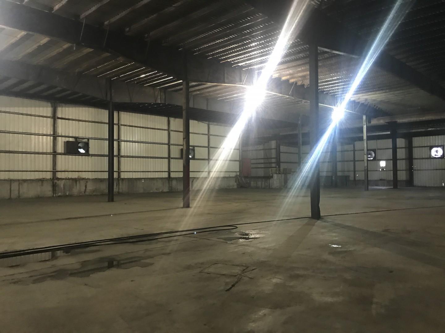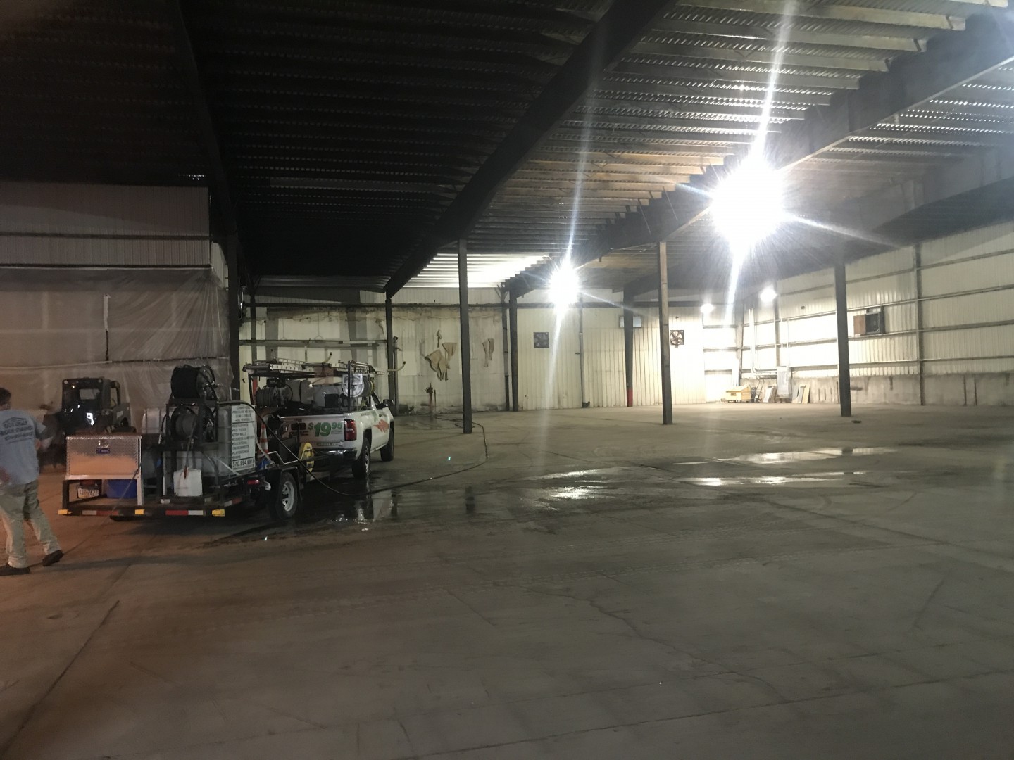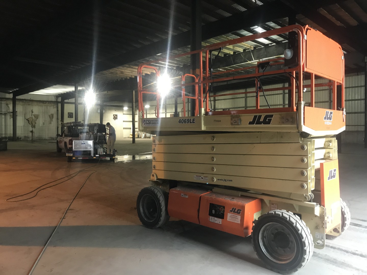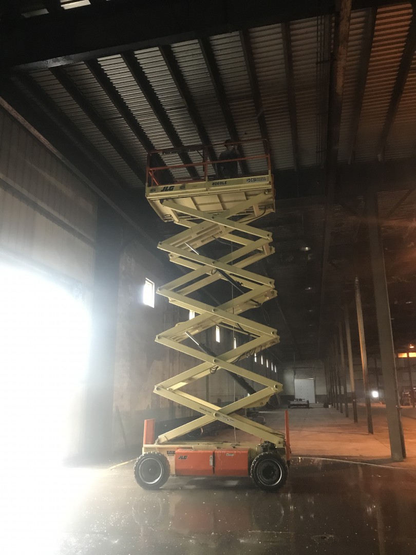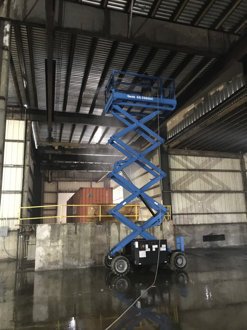 This is our new project (promo post to follow) we just started. It's a 52,000 square foot warehouse. We are cleaning the interior ceiling decking, purlins, girts and corrugated metal walls. Two machines, three men and plenty of water to supply the two machines with plenty to spare. We tapped into a stand pipe. The guys love working off the scissor lifts. Customer supplied them. We are removing loose dirt, rust and insulation remnants.