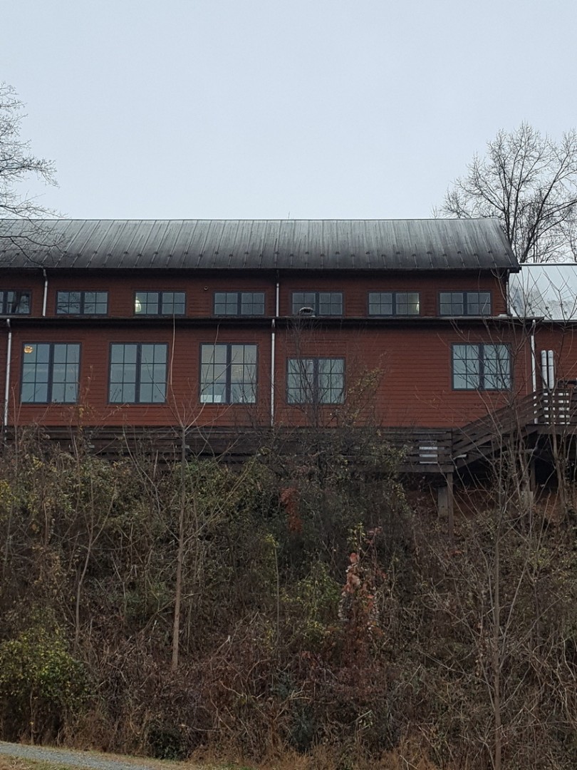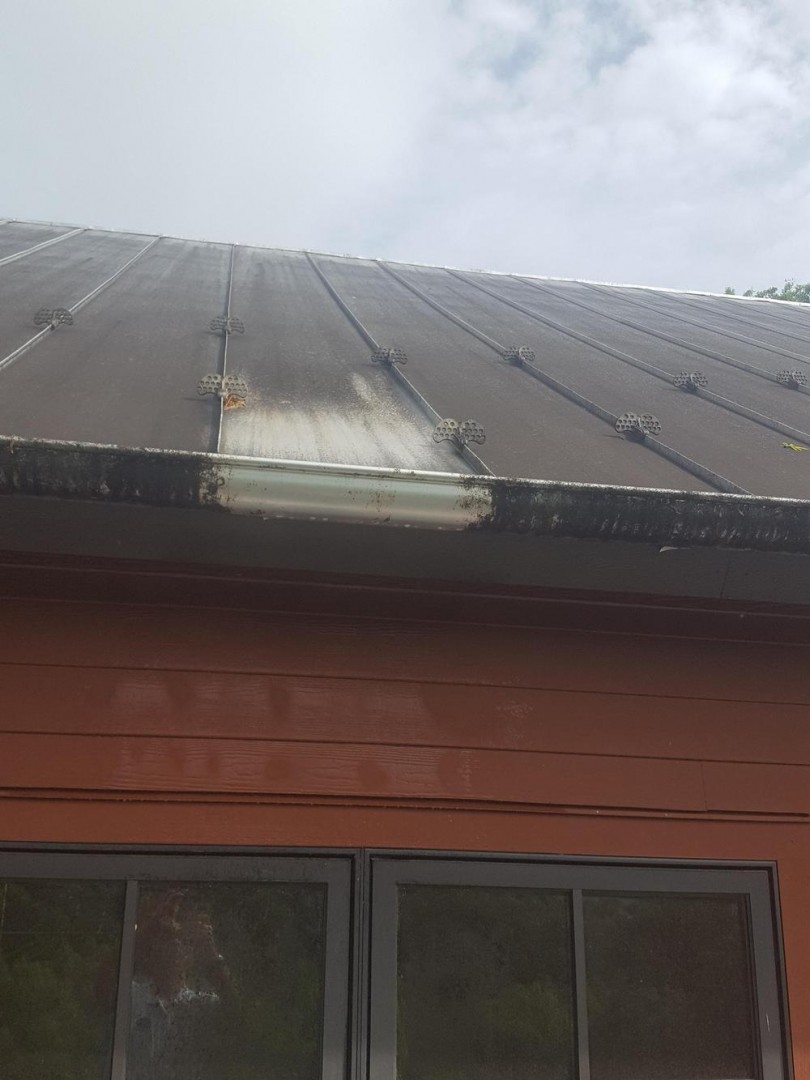 I went to look at a local cidery because their three year old standing seam roof looks real bad. The only thing the maintenance guy could tell me is they think it is coming from the CO2 exhaust. I called back today to see if he can find out what else is in the exhaust. As you can see in the picture with an arrow pointing to the exhaust, it goes onto the lower roof with a lot of force, then goes everywhere to include half of the windows. As soon as we get a break in weather I will go up there and do a test to see what will work the best. In the mean time I thought I would see what you all think.