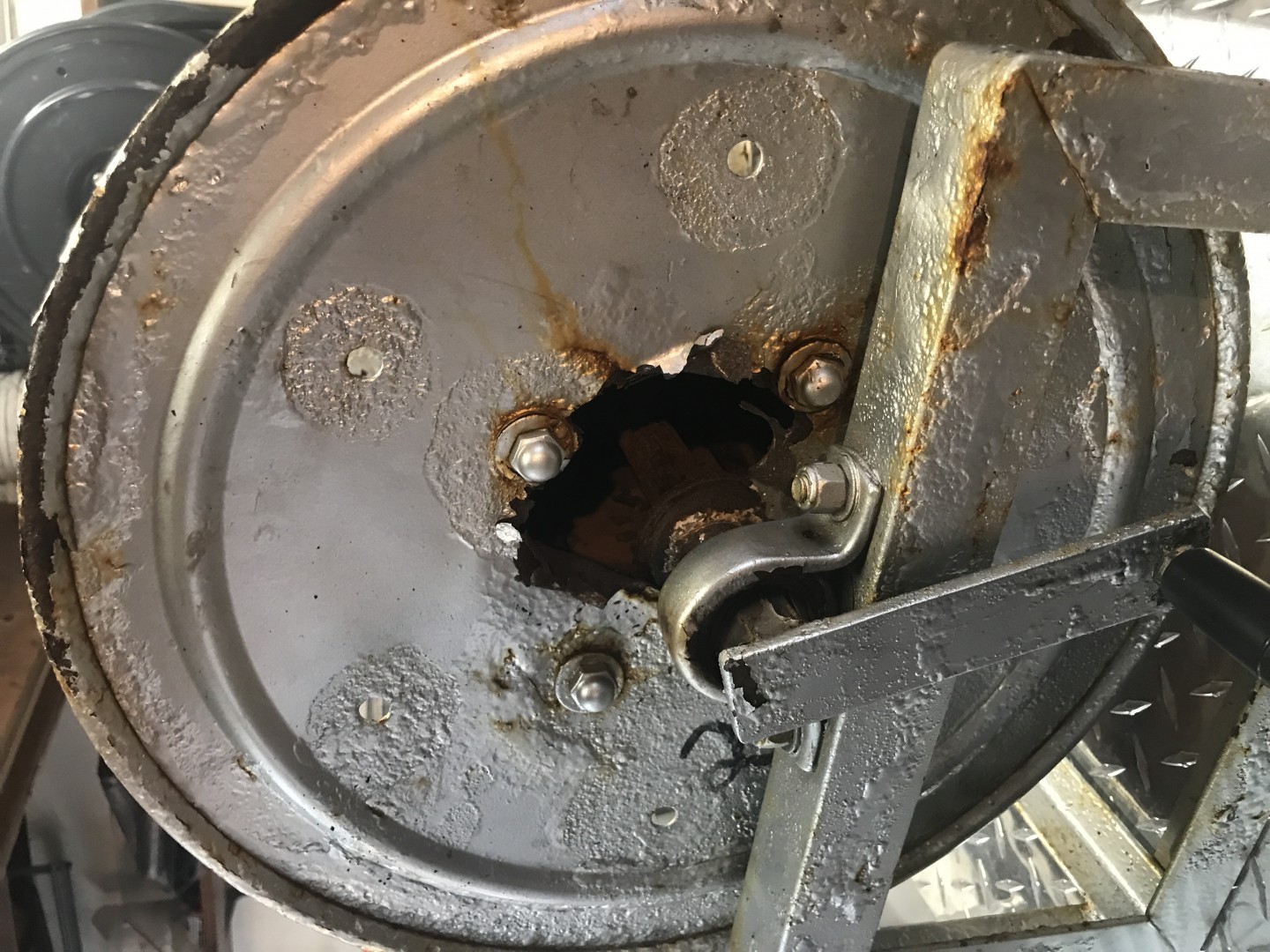 I have had this hose reel for over seven years and it finally let go. We have added this to our "Hall of Shame" in the shop. This reel had thousands of gallons roof mix flowing through it over the years. I paid $100 for it. It owes me nothing. Yes we rinsed it after every job.