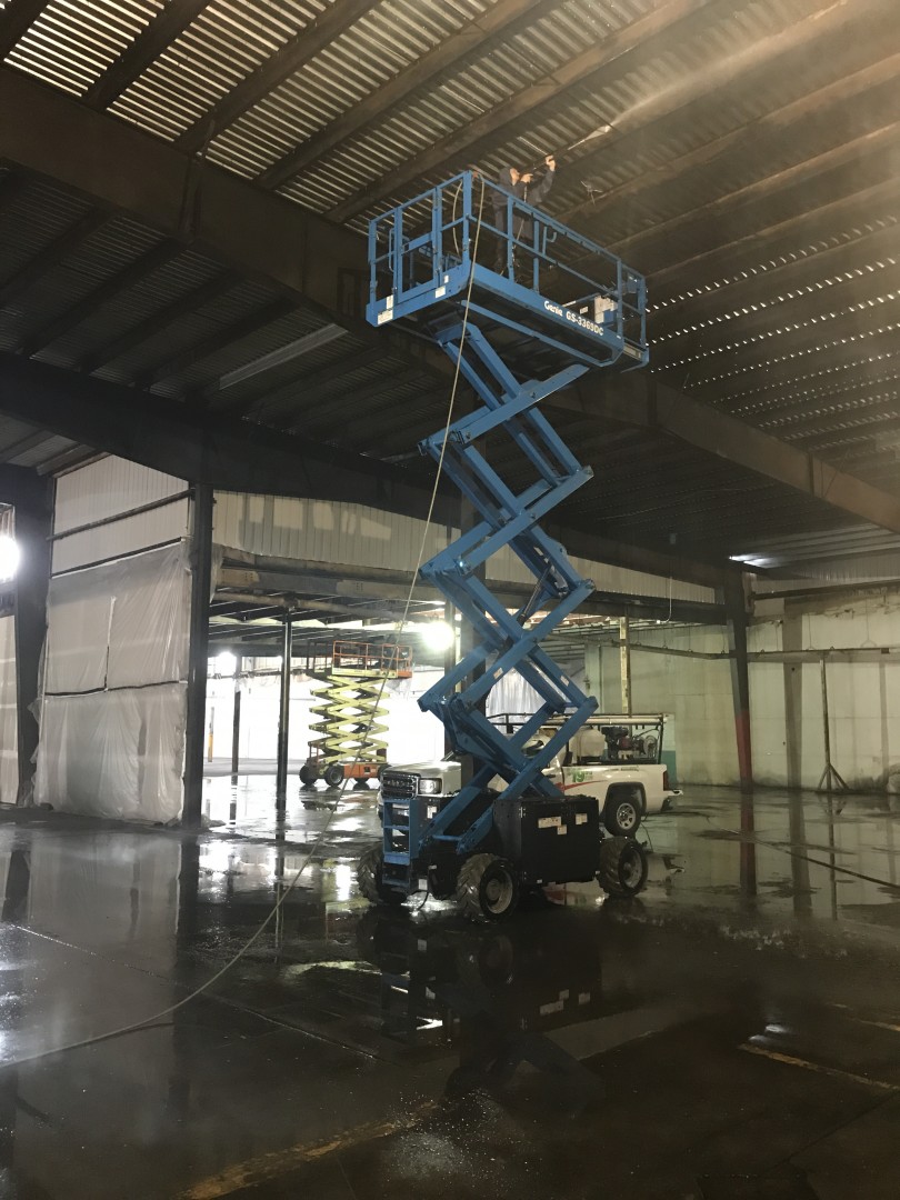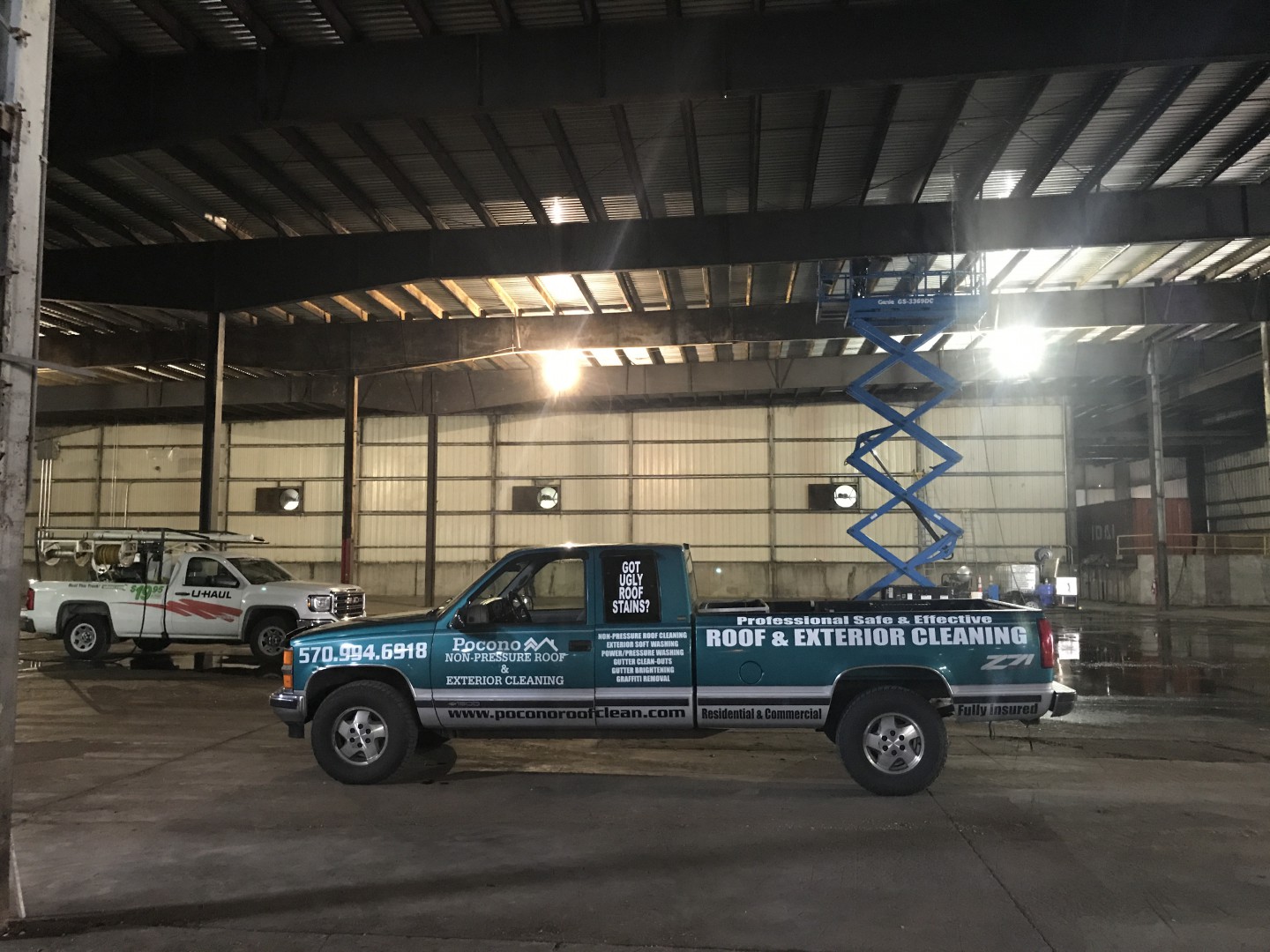 A challenge is what motivates us at Pocono Non-Pressure Pressure Roof & Exterior Cleaning. In August 2017 we were contacted by Dein Properties of Stroudsburg PA to provide them with a free quote to completely power wash the interior and exterior of this warehouse located in East Stroudsburg, PA. The work included but was not limited to all ceilings, interior and exterior walls, columns, loading docks and trusses. Upon acceptance of our quote our staff engaged in this truly challenging project. Using our commercial grade equipment which included lifts, various safety apparel, pressure washers, hoses and trucks we completed this work on a timely basis for our customer.