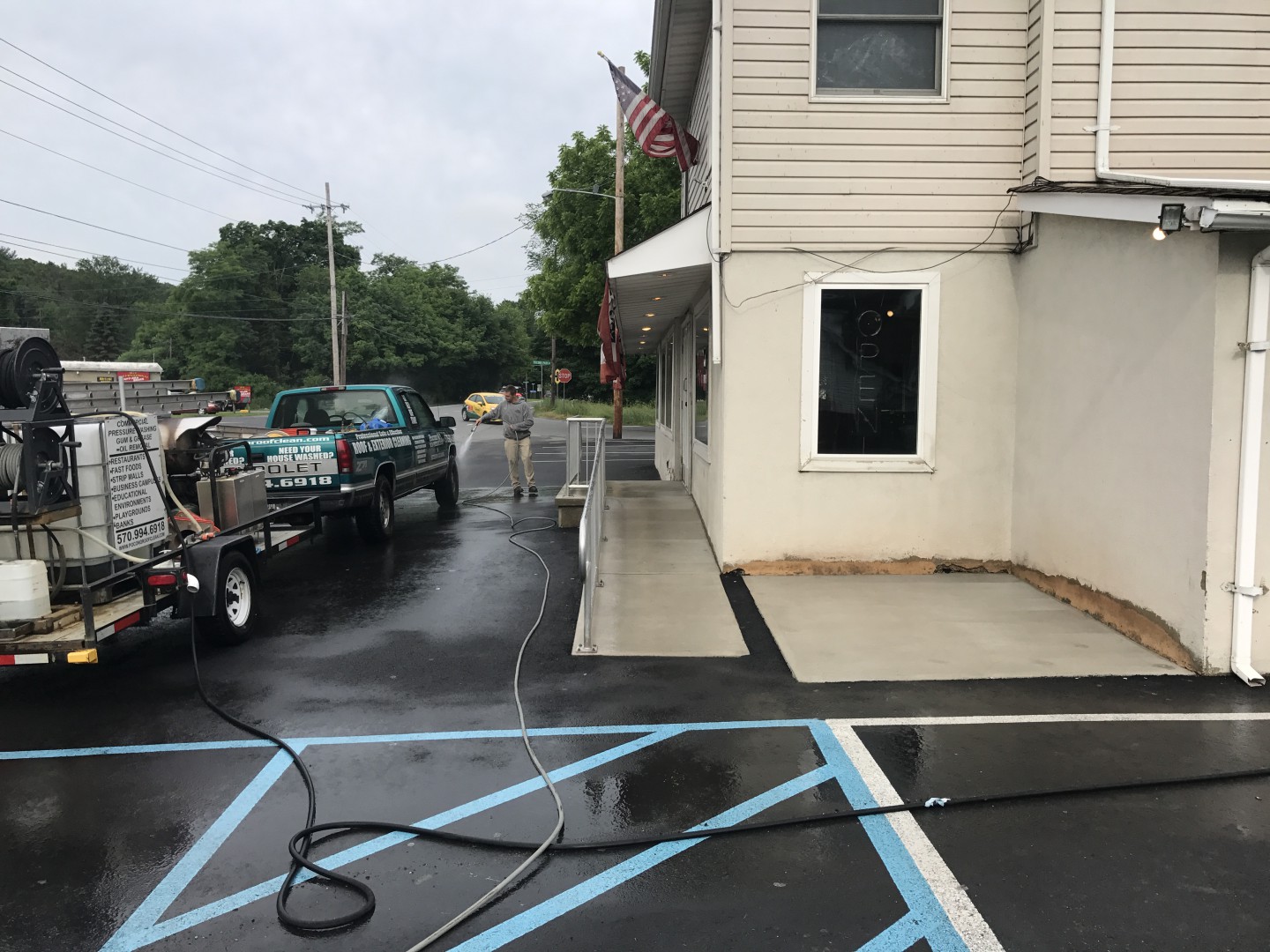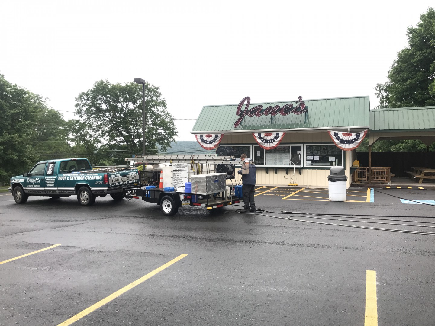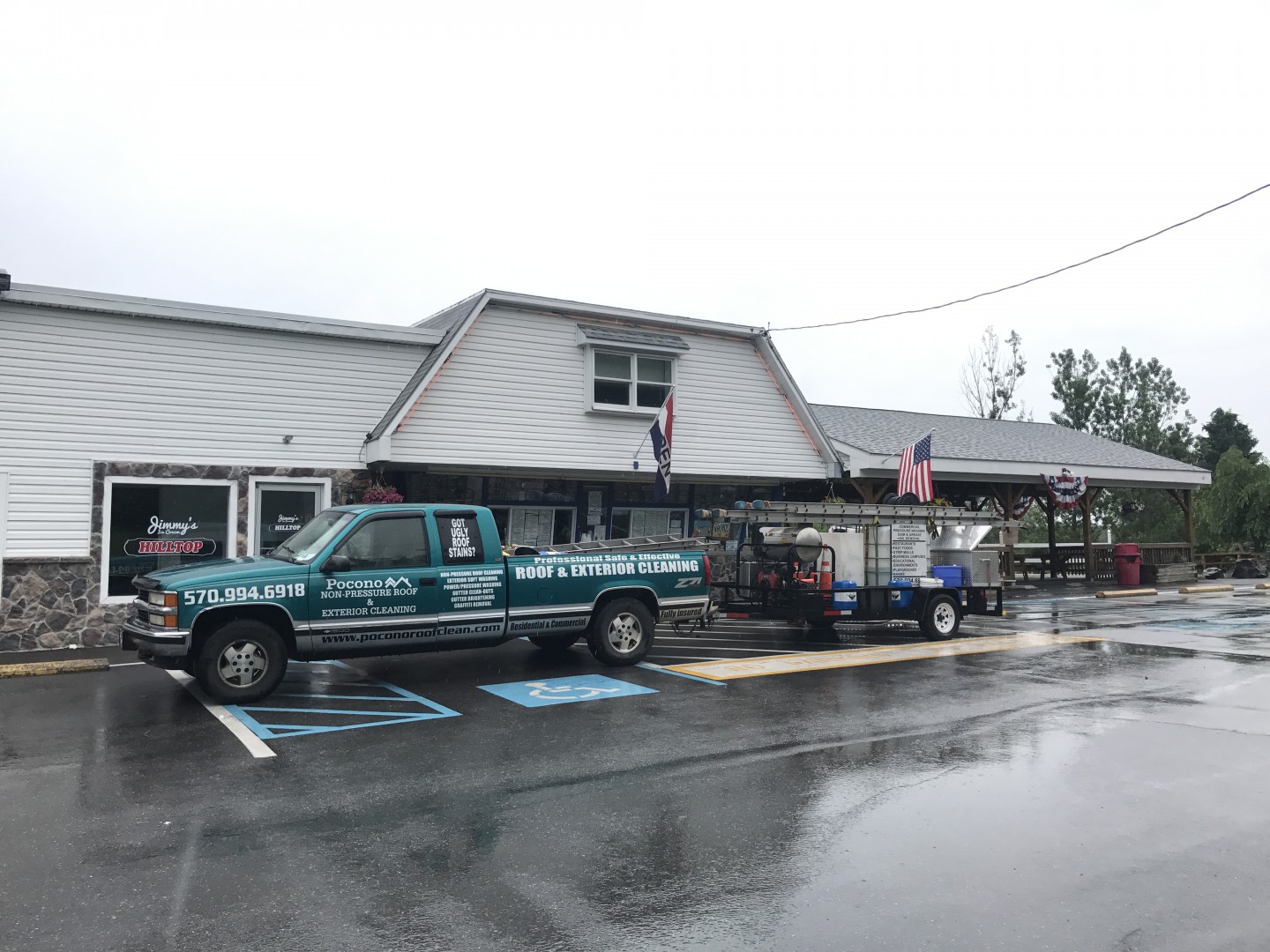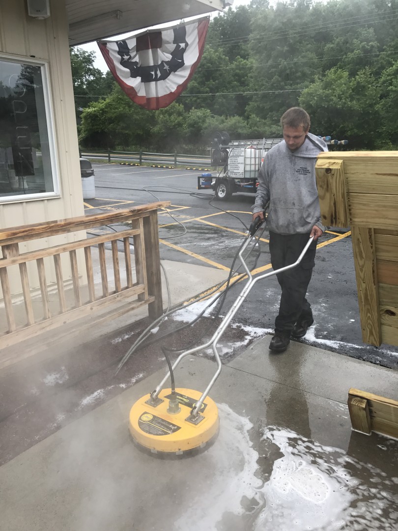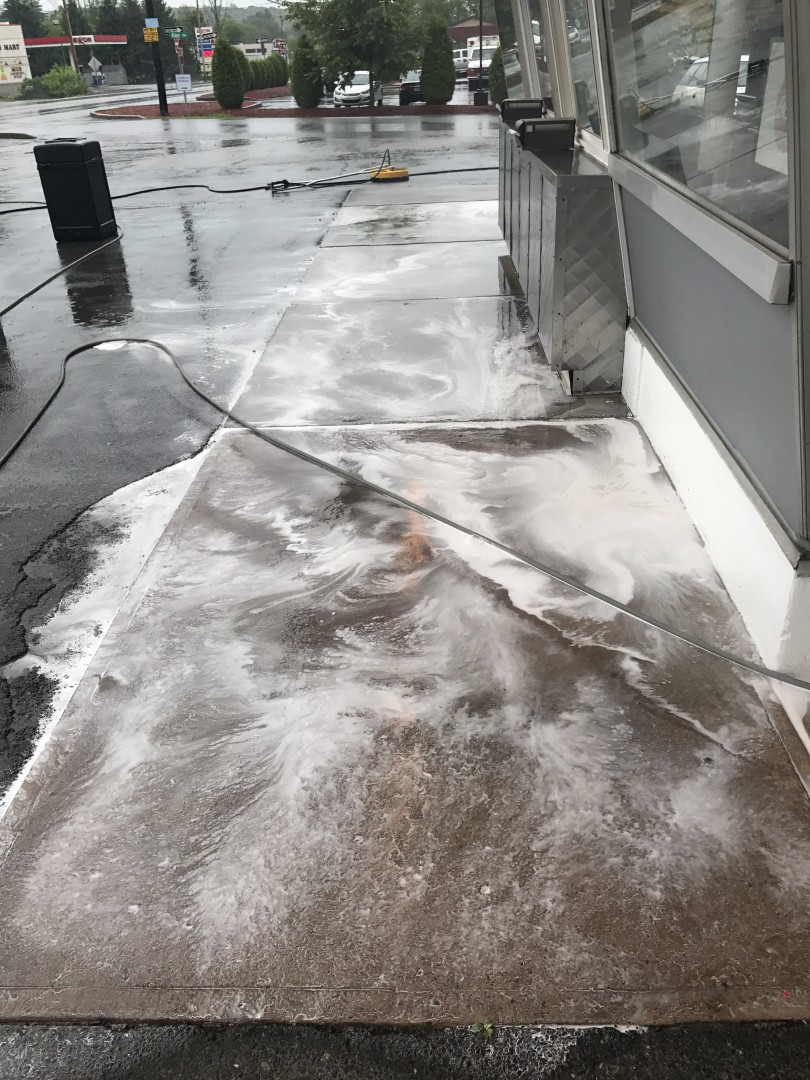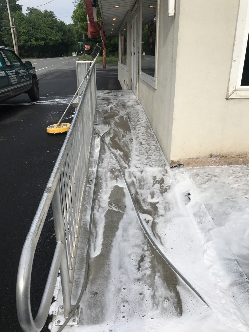 The owners of a chain of ice cream parlors around Monroe County, PA wanted to enhance the appearance of their stores. After contacting Pocono Non-Pressure Roof & Exterior Cleaning for advice our trained professionals started a monthly contract for Jimmy's Ice Cream in Stroudsburg, Hill Top Ice Cream in Brodheadsville, Gabel's Ice Cream in Tannersville and Jane's Ice Cream in Hamilton Township. With our professional commercial grade hot water power washing equipment all grease, algae and chewing gum was removed from the concrete.