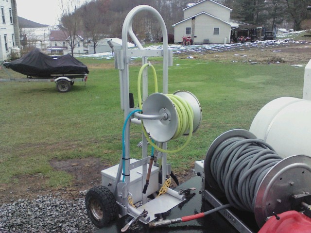 Here's a quick picture of the sprayer,...very nice for filling the void where DS'ing isn't enough,..but roof rig is over kill,...and an awesome maid cart,..holds two brushes upright,..has a hanger for the PW trigger,..a 12" extension holder for when I use the rotating nozzle,..which is also on board,...and a 5 gallon bucket sits on the cart,..usually gutter cleaner,..but was used for many different jobs this past season. It rides on the trailer held down by toggle clamps,....the toggle clamps go through the bucket cradle. The hand truck tray sits on a bracket that is out of the picture,..and it takes all the weight,..the clamps just keep it in place.
