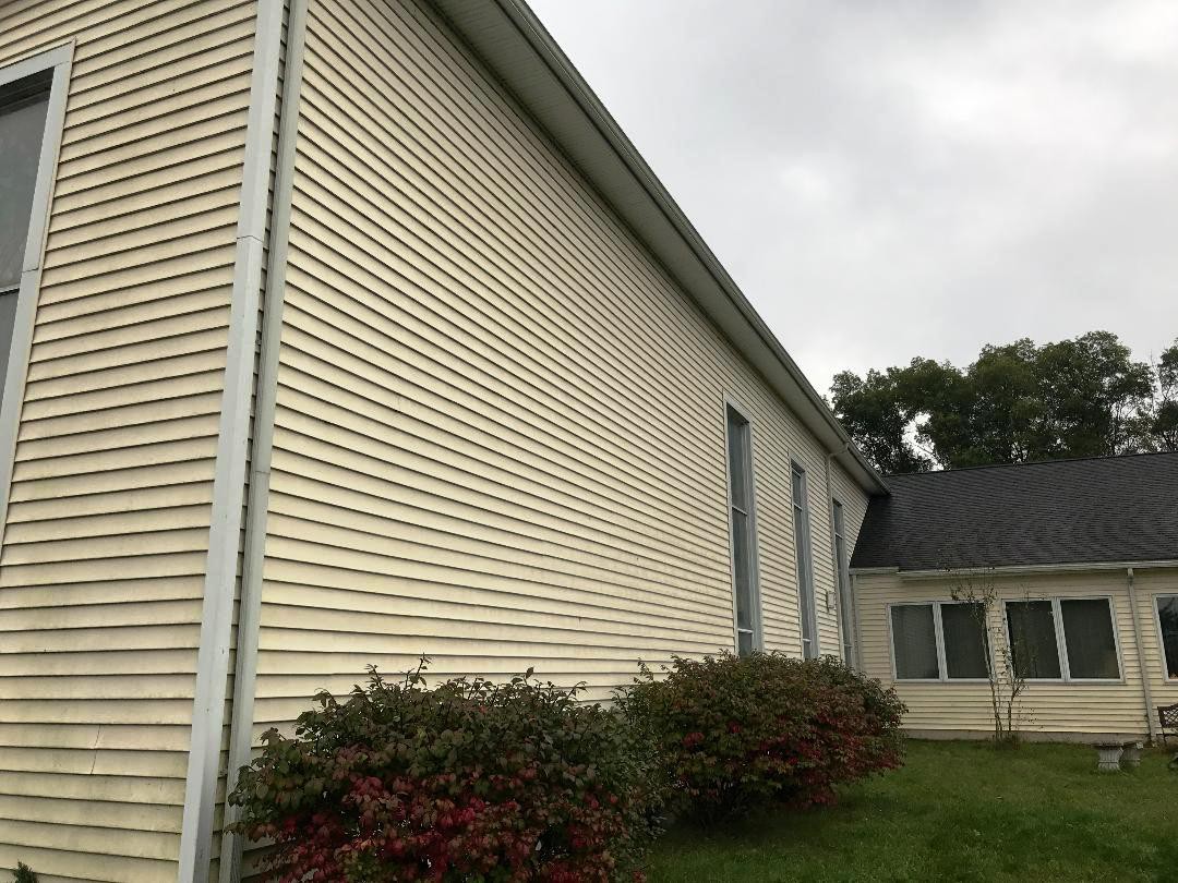 At Pocono Non-Pressure Roof & Exterior Cleaning we are called upon frequently to clean the siding on residential , commercial and religious institutions throughout the Poconos, the Slate Belt and Lehigh Valley. As can be seen in these photos the siding on the Community Presbyterian Church in Mount Bethel, PA was in dire need of cleaning. The leaders of this institution contacted us to give them a free quote to completely clean the vinyl siding, concrete and wood.