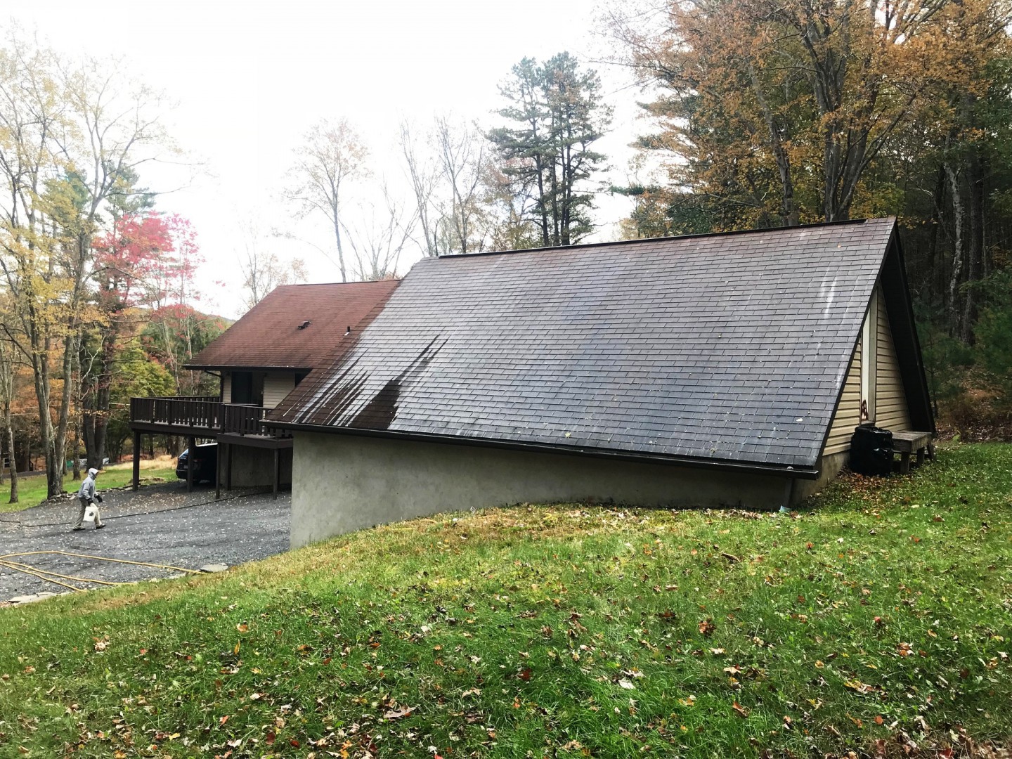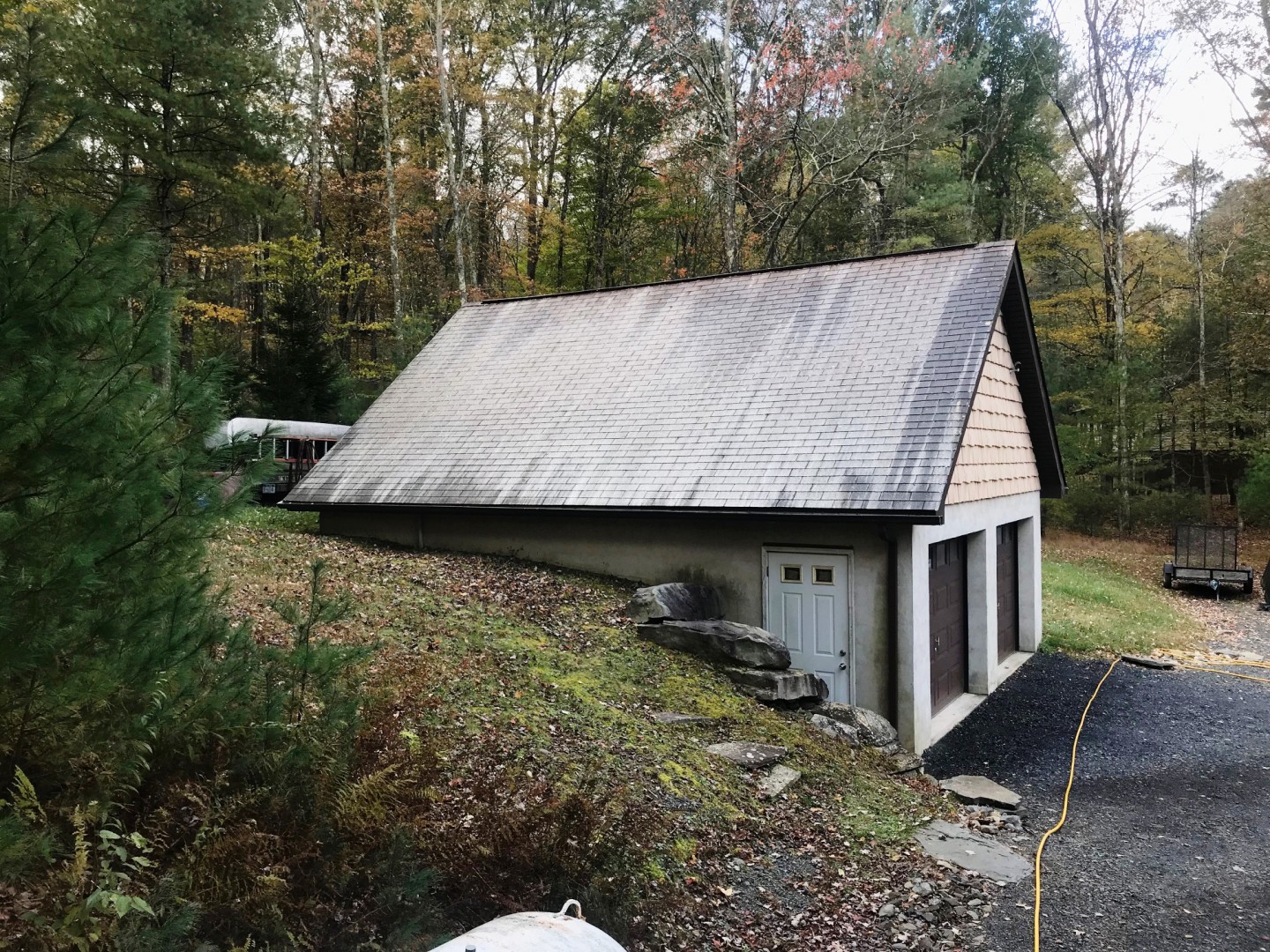 When our customers call us at Pocono Non-Pressure Roof & Exterior Cleaning to do roof cleaning we visit all sites to do our free no obligation quote. This property owner just wanted the garage roof cleaned. As you can see by the photo all black algae was eradicated from the roof in a safe and professional manner by our dedicated staff of trained and insured professionals.