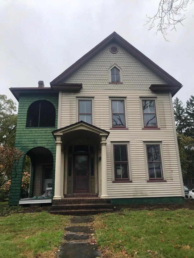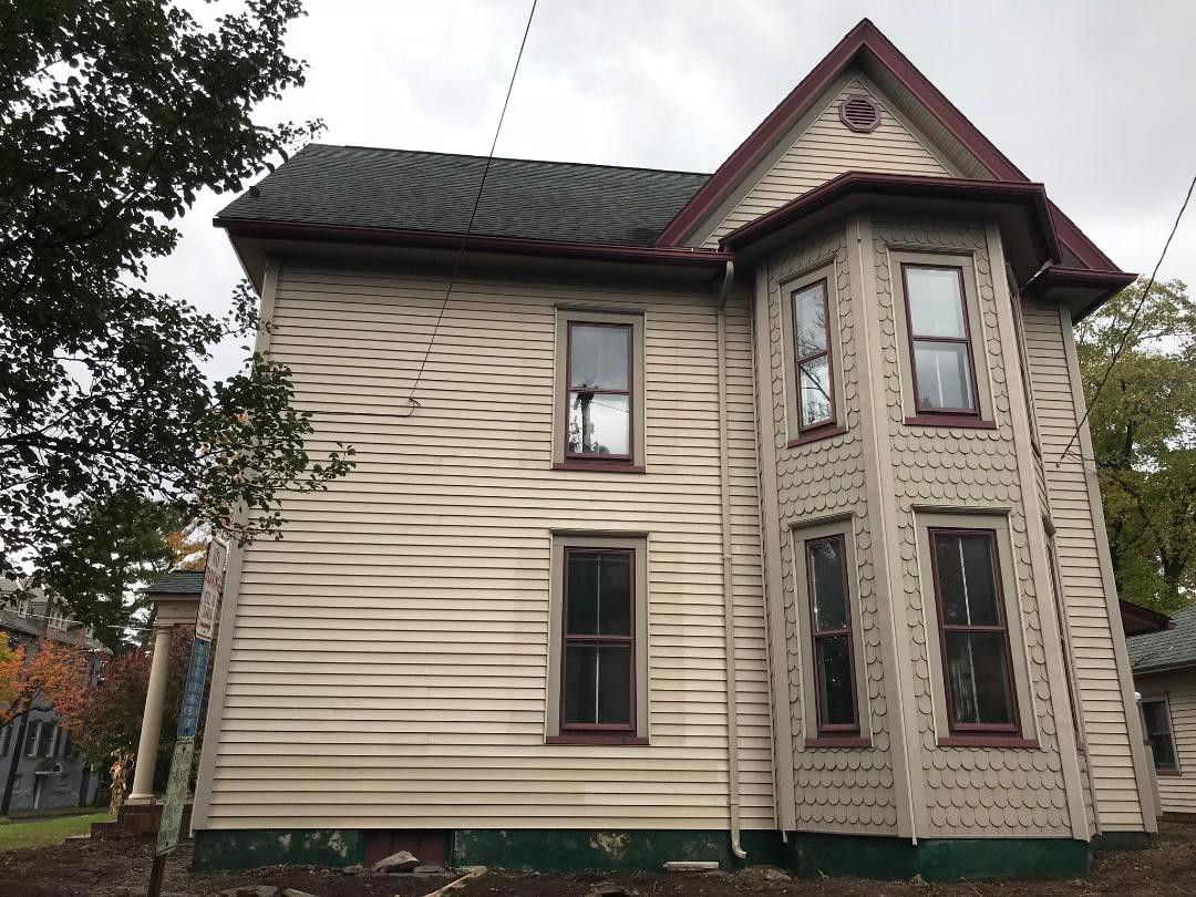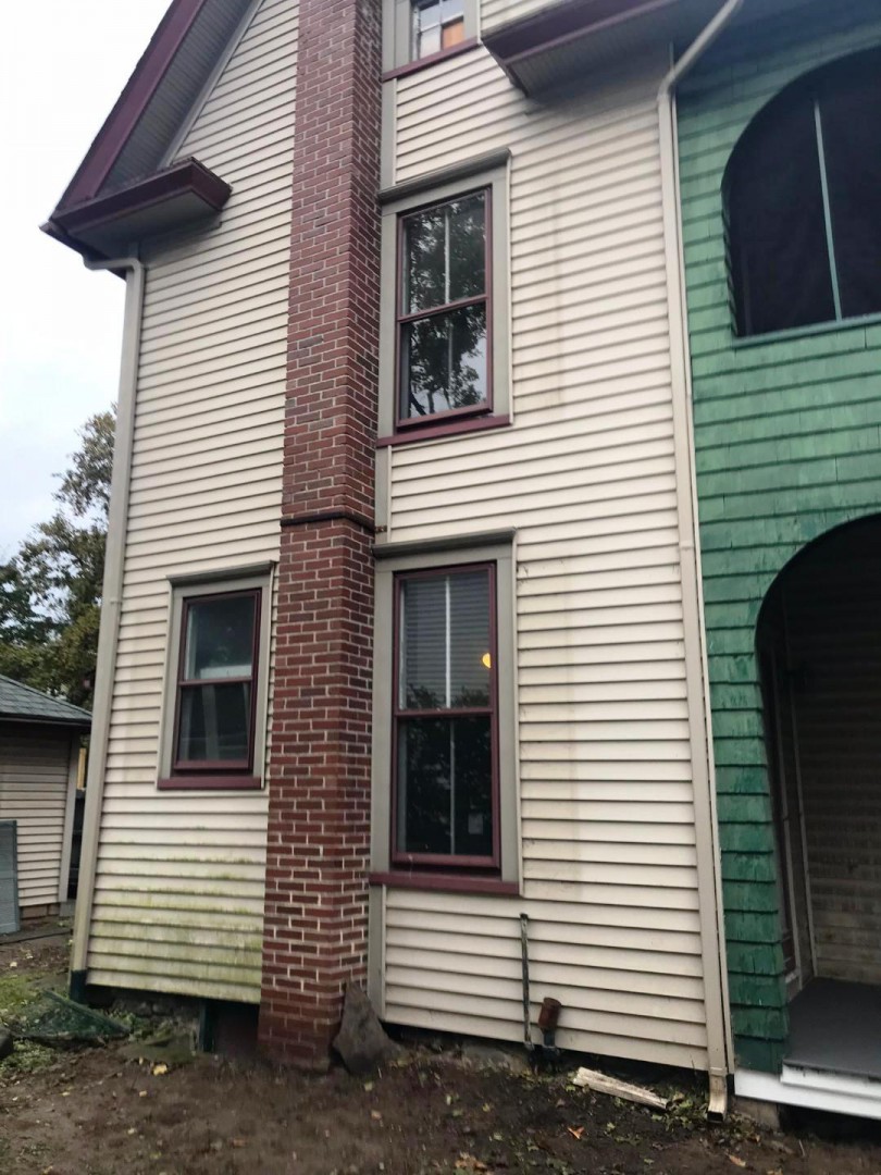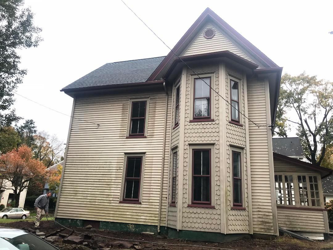 This homeowner recently bought this beautiful historic property in the Hill section of Stroudsburg PA. He wanted the organic growth (algae) and soot removed from the siding, wood work, soffits and fascia without damaging any part of the structure. Once our team of trained and insured professionals at Pocono Non-Pressure Roof & Exterior Cleaning visited the site we suggested the soft washing of the property. This method is productive and will not harm the siding, windows, etc.