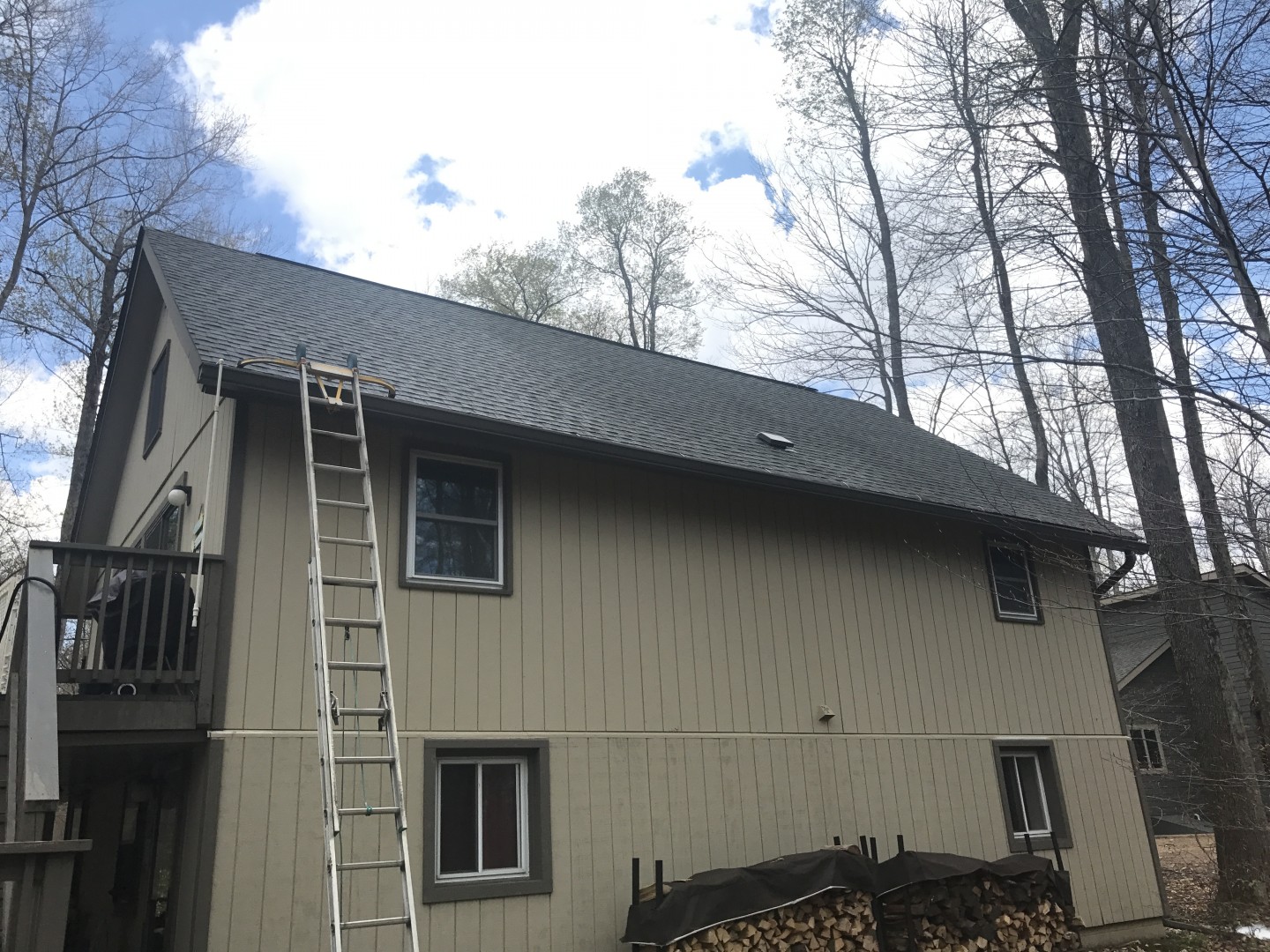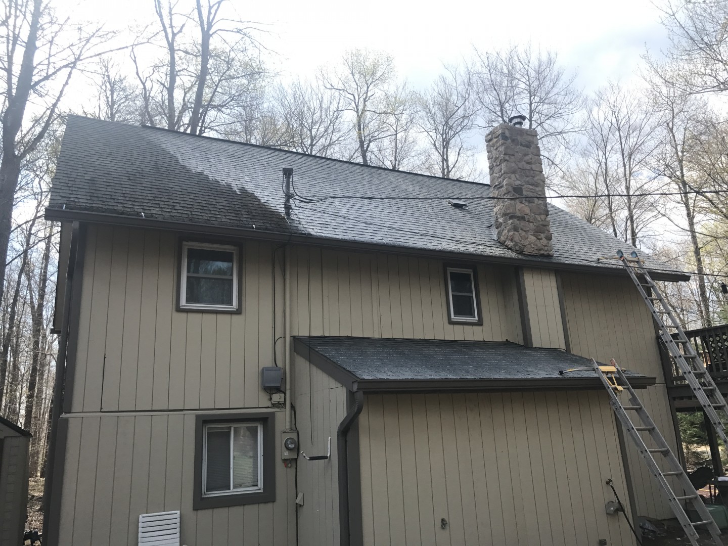 This roof was infested in blake algae due to the north facing roof and the abundance of very tall trees. The insurance company threatened to cancel the homeowners policy unless it was cleaned. Fortunately, the homeowner reached out to us at Pocono Non-Pressure Roof & Exterior Cleaning to give them a quote for the work. After visiting the property we issued our "free" quote to the customer, which satisfied both the homeowner as well as the insurance company. The work was scheduled and completed shortly thereafter. Our staff of fully trained and insured professionals addressed the issue with our professional grade truck mounted equipment. The black algae was completely eradicated leaving the roof sanitized and in it's original condition.
