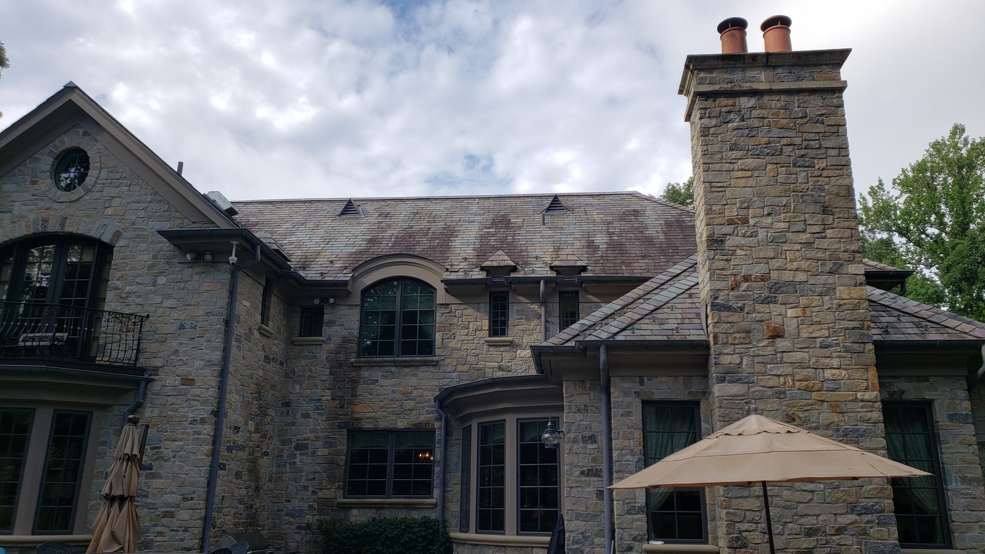 House is basically a top of the line 9 year old mansion. It has a slate roof that is in need of cleaning, mostly algae- some lichen. Plus there are some precast window ledges/sills that they want cleaned.